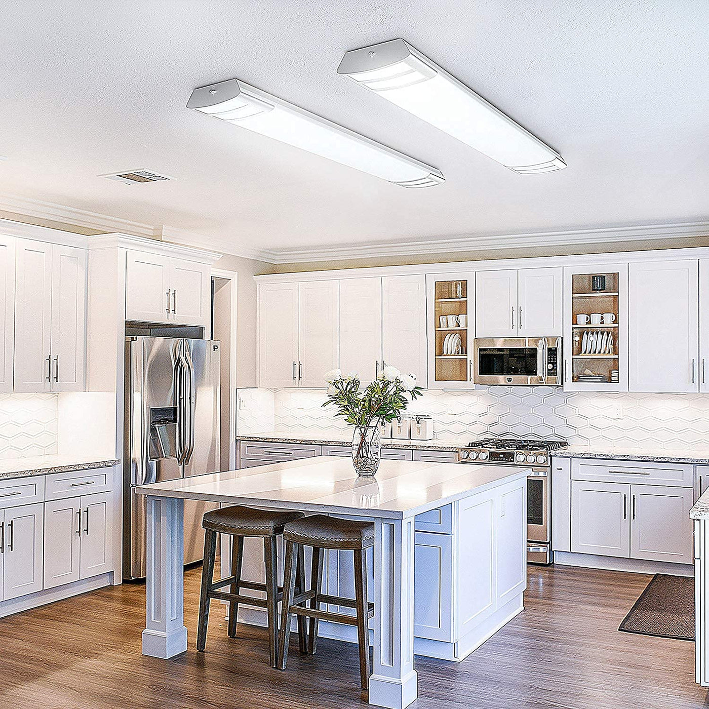 Q: What is the brightness of the ANTLUX 4ft LED Flush Mount Linear Lights?A: The ANTLUX 4ft LED Flush Mount Linear Lights provide a brightness of 4500 lumens, making them an excellent choice for illuminating kitchens and other spaces.
