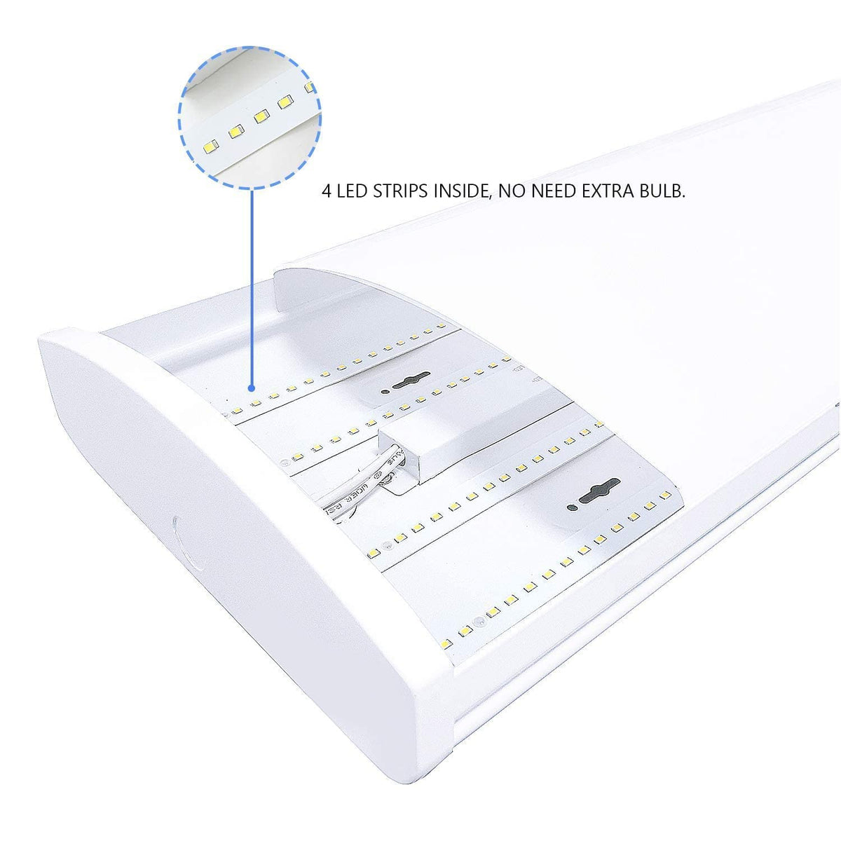 Features of LED Wraparound Light 4 feet Durable steel construction with knock outs on ends and assemble the lights in line. Easy and fast installation, Very convenient and Hassle-free installation. No need to replace led strips or the bulbs. Outstanding thermal solution suit for usage in commercial application and provide wide angle brightness control. Energy-efficient LED technology, lower energy usage and cost. Emits over 8500 Lumens. Eye-case design. No Glare, no shadow, no spot dot.