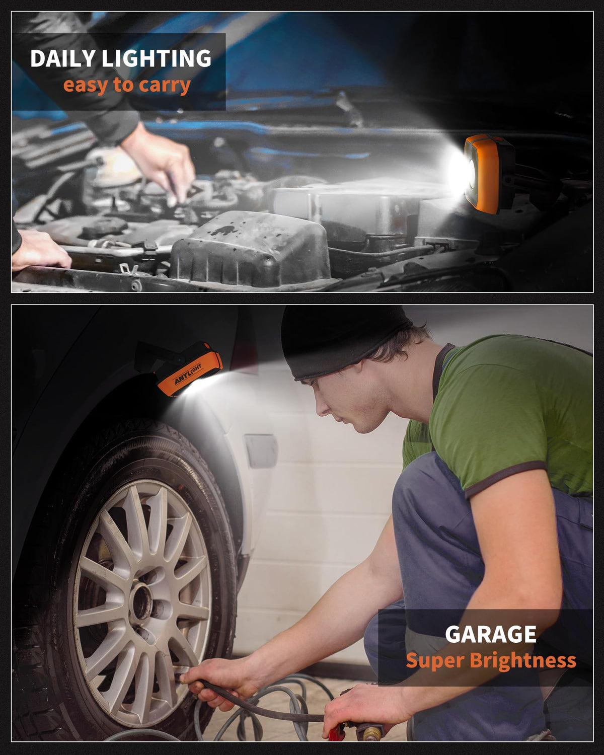 Q: Can the ANYLiGHT Work Light be used for outdoor activities?A: Absolutely! The ANYLiGHT Work Light is designed for both indoor and outdoor use. Its strong magnetic base and hook design make it ideal for camping, auto repairs, emergency roadside situations, and other job repairs.
