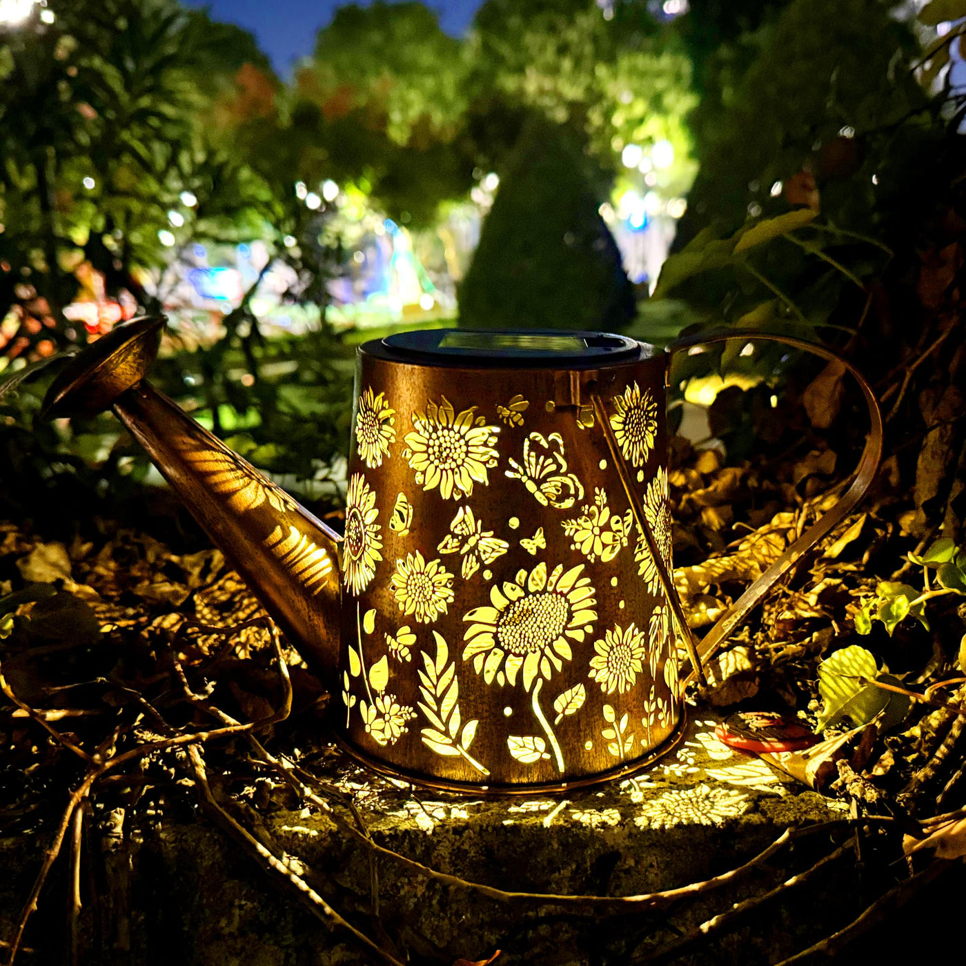 Q: What kind of ambiance does the ANYTALK Solar Watering Can create?A: The ANYTALK Solar Watering Can features cascading lights that realistically replicate the effect of running water, creating a mesmerizing and dreamy atmosphere in your garden or yard at night. The light emitted through the hollow carved metal plate adds an unexpectedly beautiful touch to your outdoor space.