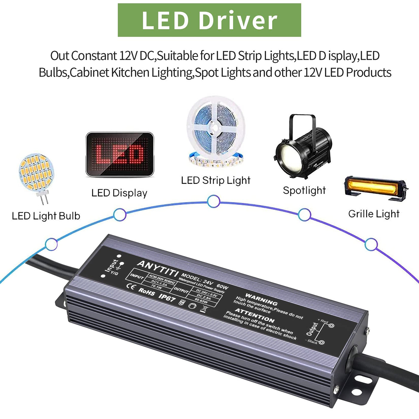 Q: What is the maximum output of the ANYTITI LED Driver?A: The ANYTITI LED Driver has a maximum output of 24V DC and 2.5A, providing a total wattage of 60W, making it suitable for various lighting applications.