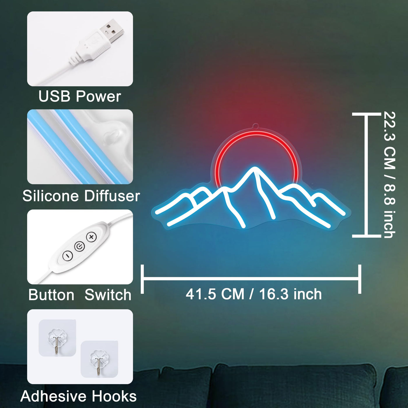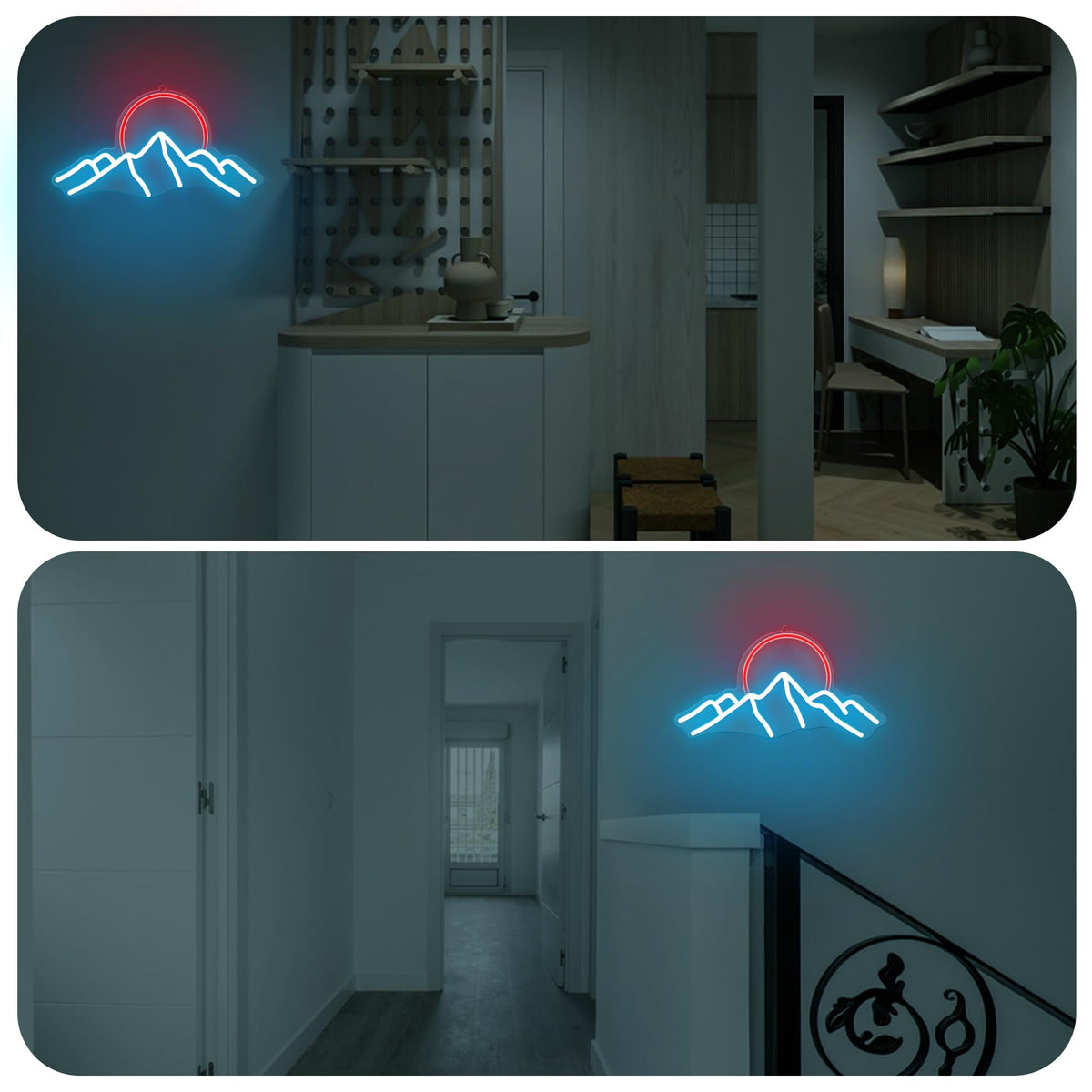 - **Artistic Inspiration**: Infused with the serene beauty of sunrise and sunset in the mountains, this neon sign serves as a stunning visual centerpiece. Its captivating Ice Blue and red hues create a romantic atmosphere, perfect for your bedroom, living room, or any cozy nook.
