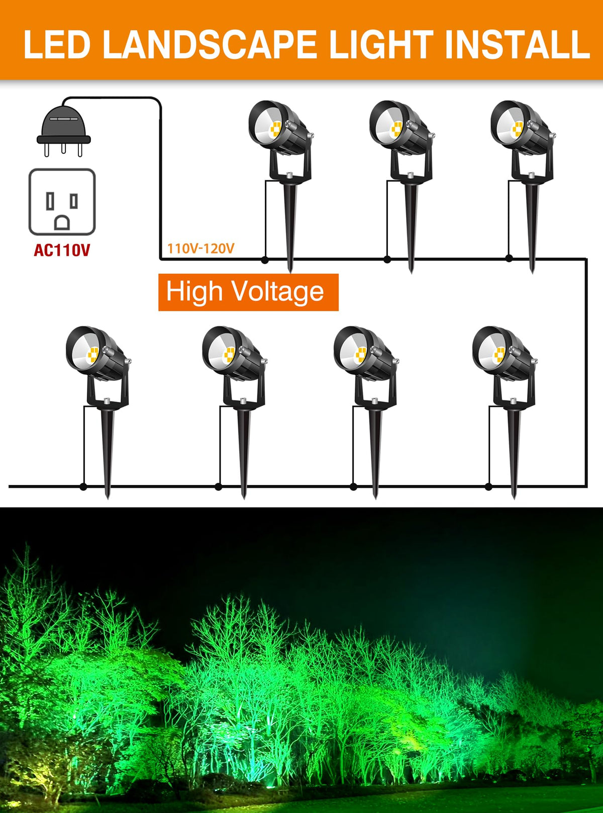 Product Description: AOAXL premium Landscape Lighting, designed to transform your outdoor spaces into stunning and inviting landscapes. Our Landscape Lights are perfect for illuminating pathways, gardens, driveways, and more, enhancing the beauty and safety of your surroundings. Crafted with high-quality Aluminum, our Landscape Lights offer durability and resistance to harsh weather conditions, ensuring long-lasting performance. The sleek and modern design seamlessly blends into any outdoor setting, adding an elegant touch to your landscape. Featuring advanced COB LED technology, our Landscape Lighting provides a powerful 7W output, delivering a brilliant 700 lumens of green light. The 3000K color temperature creates a warm and welcoming ambiance, perfect for creating an inviting atmosphere in your outdoor spaces. With a high Color Rendering Index (CRI) of 90+, our Landscape Lights ensure accurate color representation, enhancing the beauty of your plants and surrounding elements. The integrated spot type LED (COB) offers precise and focused lighting, allowing you to highlight specific features in your landscape. Installation is a breeze with our Landscape Lights, offering two convenient ways to install. Whether you prefer to mount them on the ground or stake them into the soil, our lights provide flexibility to suit your landscaping needs. Designed to withstand the elements, our Landscape Lights are IP67 waterproof rated, ensuring reliable performance even in rainy or snowy conditions. The adjustable head rotates up to 270, allowing you to direct the light exactly where you need it, while the 90 beam angle provides wide coverage, illuminating a large area. With an impressive lifespan of 50,000 hours, our Landscape Lights are built to last, saving you time and money on frequent replacements. Backed by a 3-year warranty, you can have peace of mind knowing that our lights are built to withstand the test of time. Versatile and multi-functional, our Landscape Lights are not limited to just outdoor lighting. They can also be used for uplighting, adding a dramatic effect to trees or architectural elements. Additionally, our lights are perfect for creating a colorful ambiance, with the option to choose from our Green flood light range, offering various color options to suit your mood or occasion. Landscape Lighting kit comes complete with all the accessories needed for easy installation and operation. The wired design ensures a secure and reliable connection, guaranteeing optimal performance. In conclusion, our Landscape Lighting is the perfect choice for anyone looking to enhance their outdoor spaces. With its premium features, durable construction, and stunning illumination, our lights will transform your landscape into a captivating and inviting oasis. Illuminate your surroundings with our Landscape Lights and create a mesmerizing ambiance that will leave a lasting impression. Specifications: Model Number: AOLM039 Wattage: 7W Input Voltage: 90-265V Color Temperature: Green(3000K) Waterproof Rate: IP67 Lifespan: 50,000 hours Caution: 1. Please read the instruction carefully before installation and preserve it well. 2. Must be installed and assembled by a qualified electricain. 3. Before installation, please cut off the main power. 4. Be sure to connect the ground lead. 5. Never use the lamp without the protective shield. If its broken, please replace it with a new one. 6. Prompt response within 24 hours. 7. 45 days money-back guarantee for any reason 8. 36-month warranty for quality-related issues. NOTE: Please provide the lamp with an input voltage within thespecified range to ensure reliable operation.