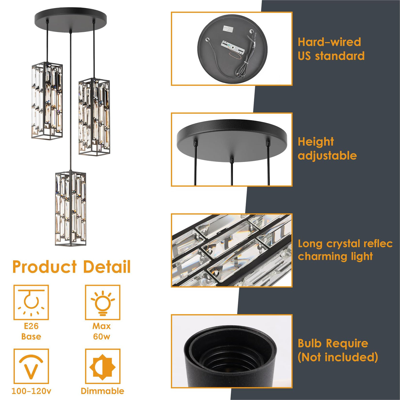 Q: What materials are used in the Aoceley pendant light?A: The Aoceley 3-Light Black Pendant Light is constructed with high-quality metal featuring a matte black surface that is sturdy and rust-resistant. It also incorporates thickened clear crystals that enhance its beauty both when the light is on and off.