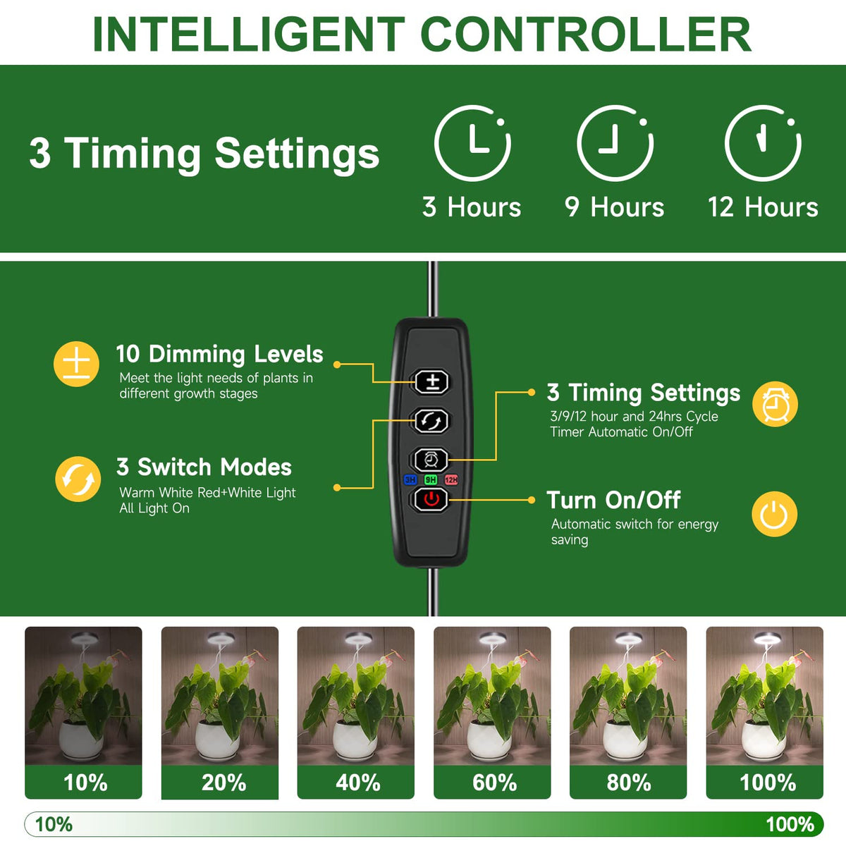 - Timer Functionality: The built-in timer offers three cycle timing options (3H, 9H, and 12H), enabling you to set the light to automatically turn on and off according to your preferences, ensuring your plants receive consistent care.