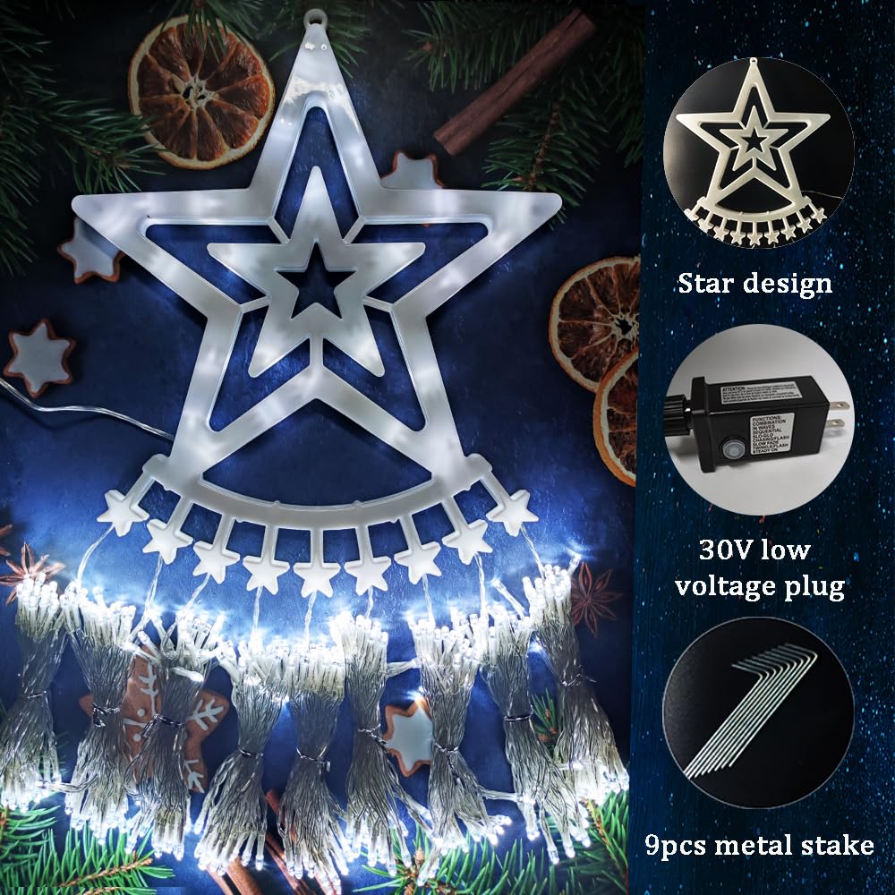 - **Impressive Size and Design**: The decoration includes a 12-inch top star and nine 11.8-foot strings, extending a total length of 12.6 feet, adorned with 350 LED lights. This oversized light show is designed to resemble a beautiful waterfall, ensuring your space stands out and earns compliments from neighbors.
