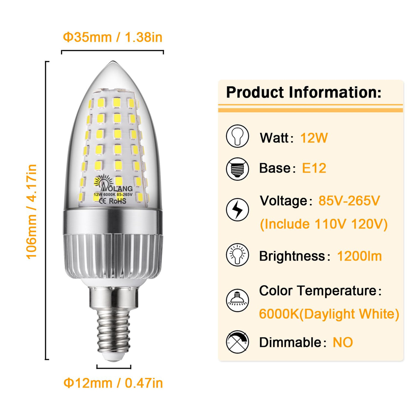 Illuminate your space with the Aolang 12W LED Candelabra Bulbs, designed for optimal energy efficiency and stunning illumination. These bulbs offer a remarkable alternative to traditional incandescent lighting, ensuring a brighter, more environmentally-friendly choice. With a lifespan of up to 30,000 hours and high brightness output of 1200 lumens, these bulbs are perfect for a variety of fixtures, from chandeliers to table lamps.