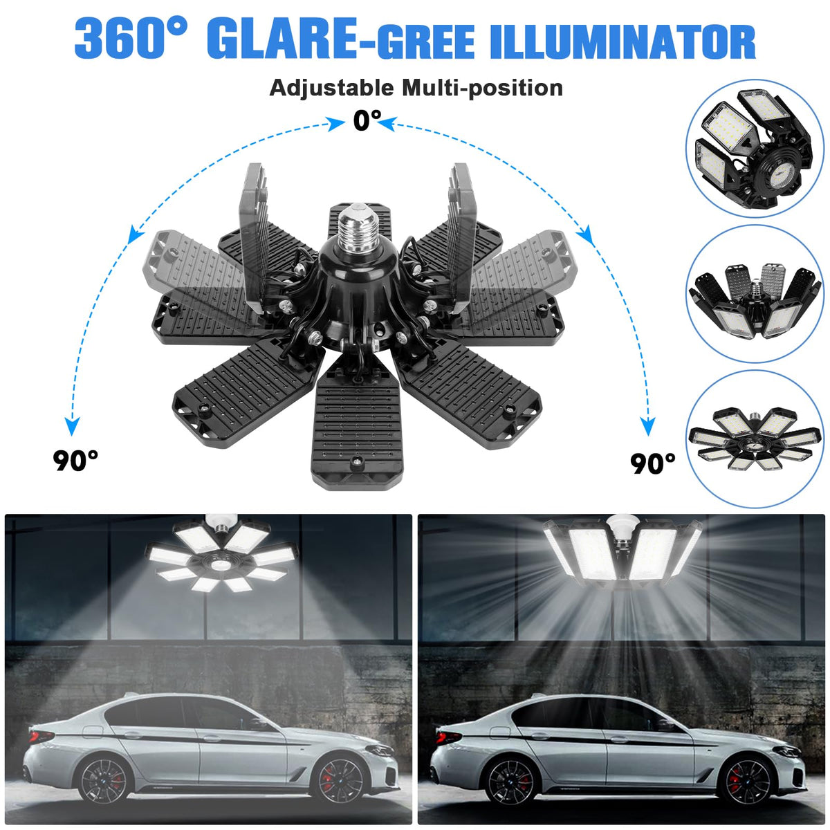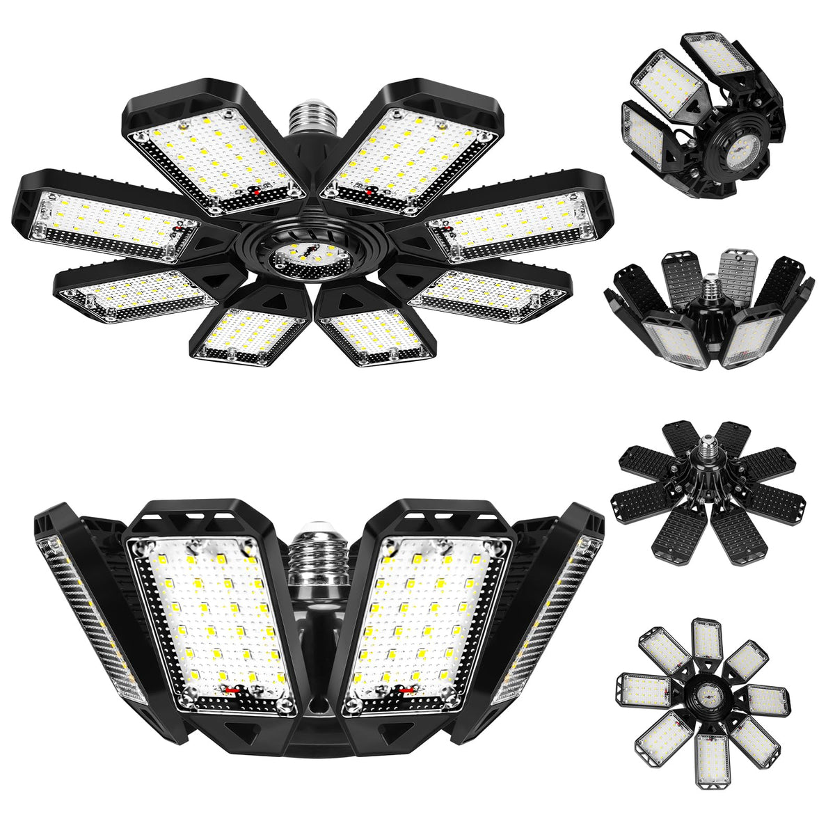 Newest 8 Panels Design: Equipped with 8 deformable panels, our garage ceiling lights can be adjusted from 0 to 90 degrees, offering full coverage without any blind spots or dizziness. This innovative design outperforms traditional 3, 4, 5, and 6 panel lights available on the market.