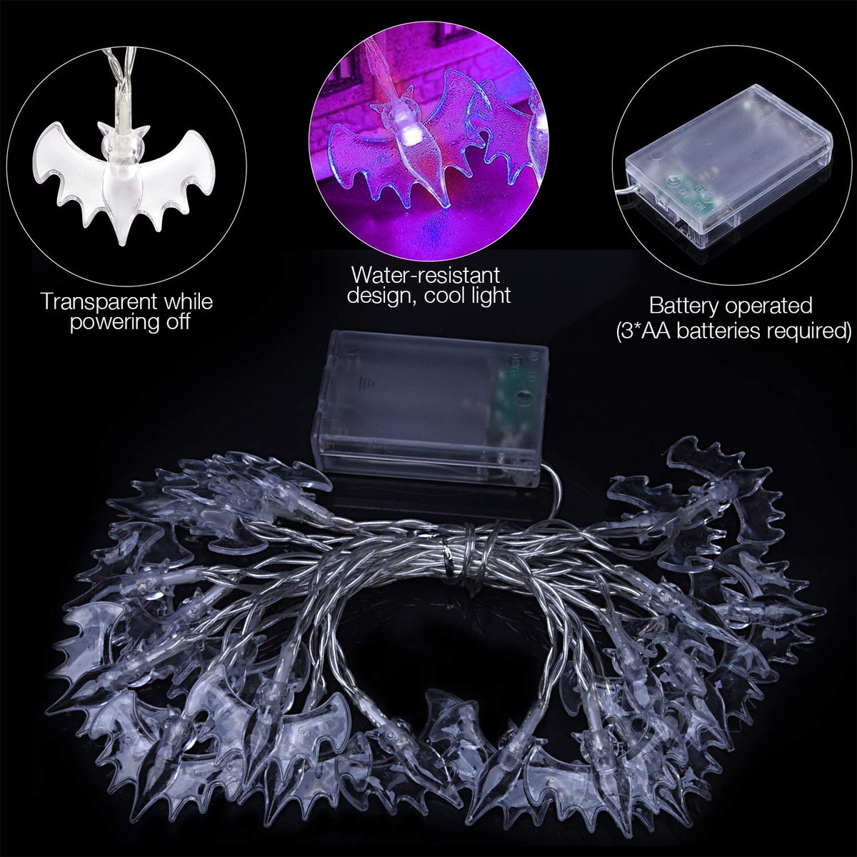Q: How do the battery-operated Halloween lights work?A: These lights are powered by 3 AA batteries (not included), allowing you to place them anywhere without needing a nearby plug socket. The clear battery box can be easily hidden from view.