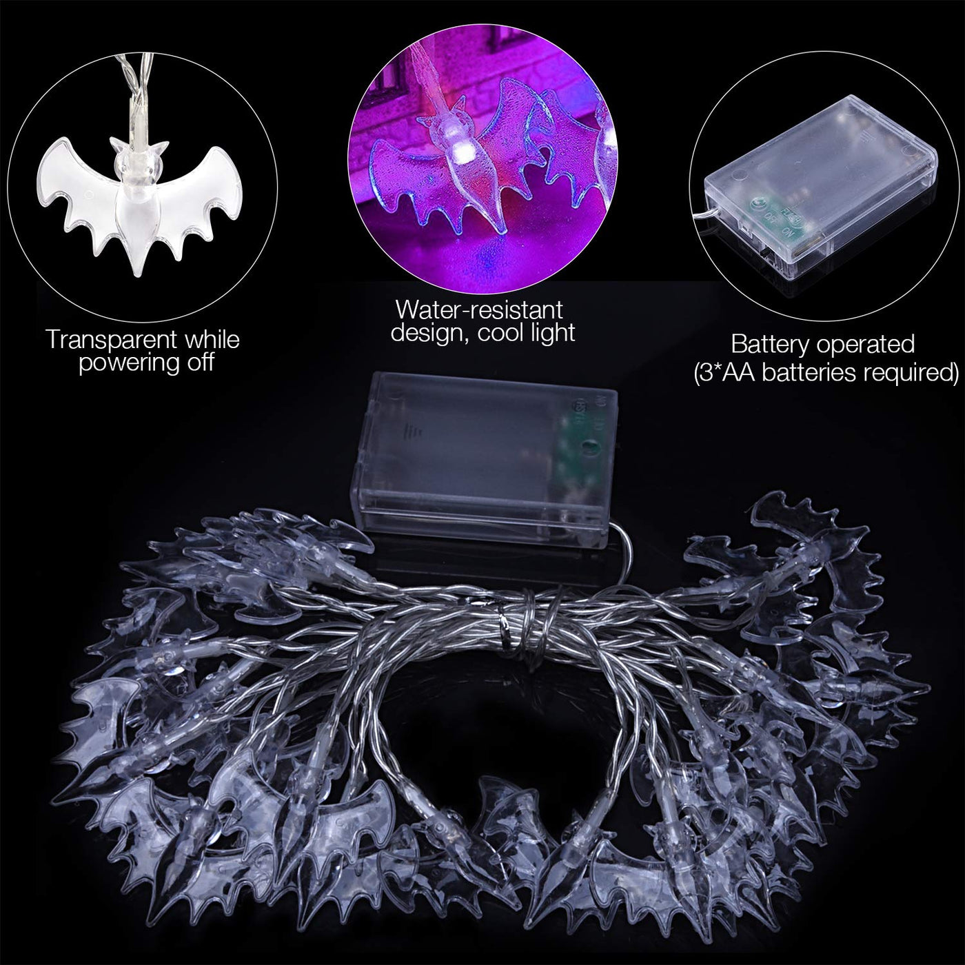 ? One of the easiest way to create a spooky Halloween display with 3 sets of battery operated fairy lights -- orange pumpkin lights, purple bat lights(after add the battery operated) and white ghost lights. ? Being battery operated, you can place these creepy crawly lights anywhere in your home without the worry of needing a plug socket nearby. This set of lights take 3 x AA batteries (not included) and the clear battery box can be easily tucked away from view. ? Perfect for Halloween theme parties, carnival, festivals, celebrations and other special events. These lights can be easily hung in the corner of your room, or around your doorway to spook your visitors this Halloween.