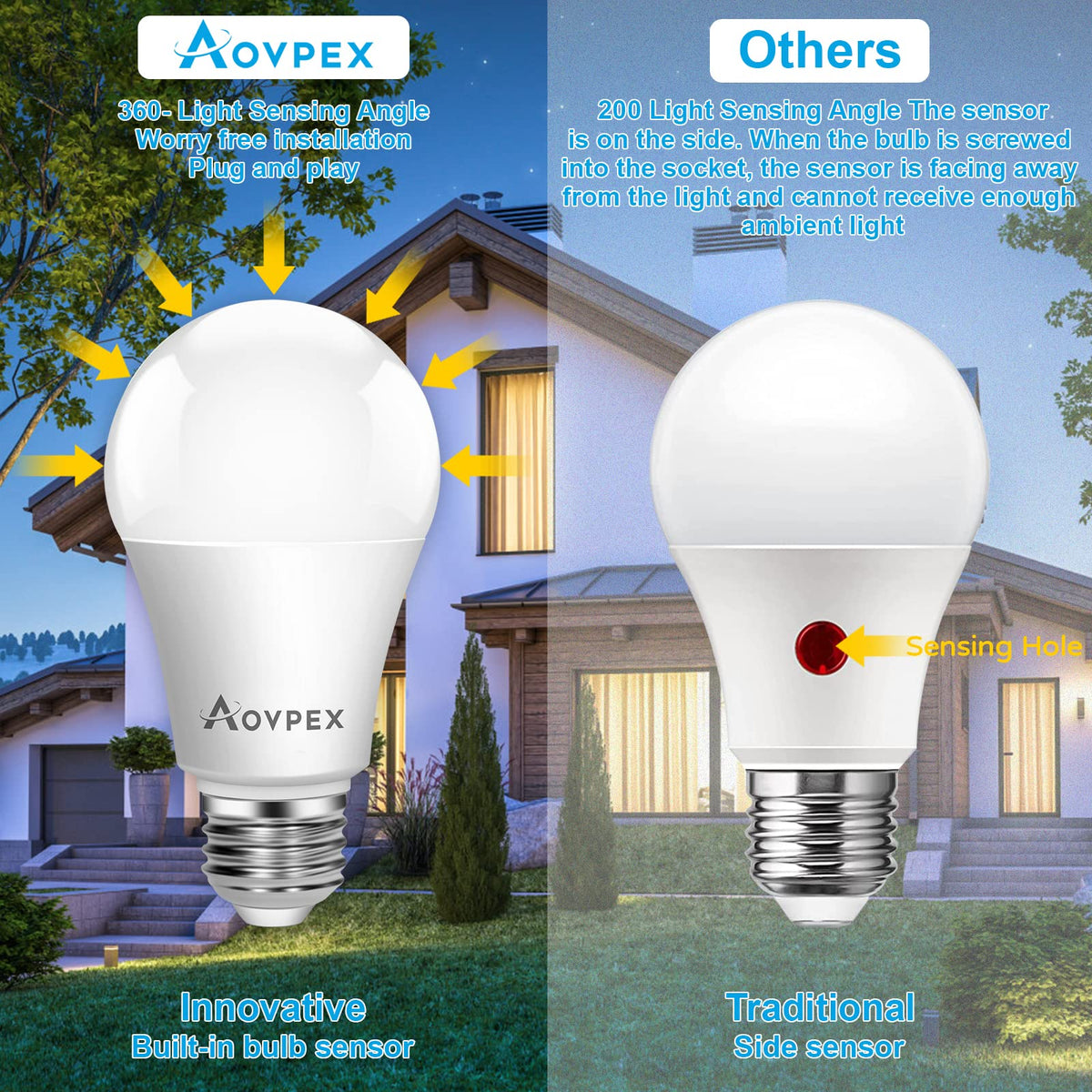 Q: How do Aovpex Dusk to Dawn Light Bulbs work?A: Aovpex Dusk to Dawn Light Bulbs feature a built-in photocell sensor that automatically turns the light on at dusk and off at dawn, providing hands-free operation for outdoor and indoor lighting needs.