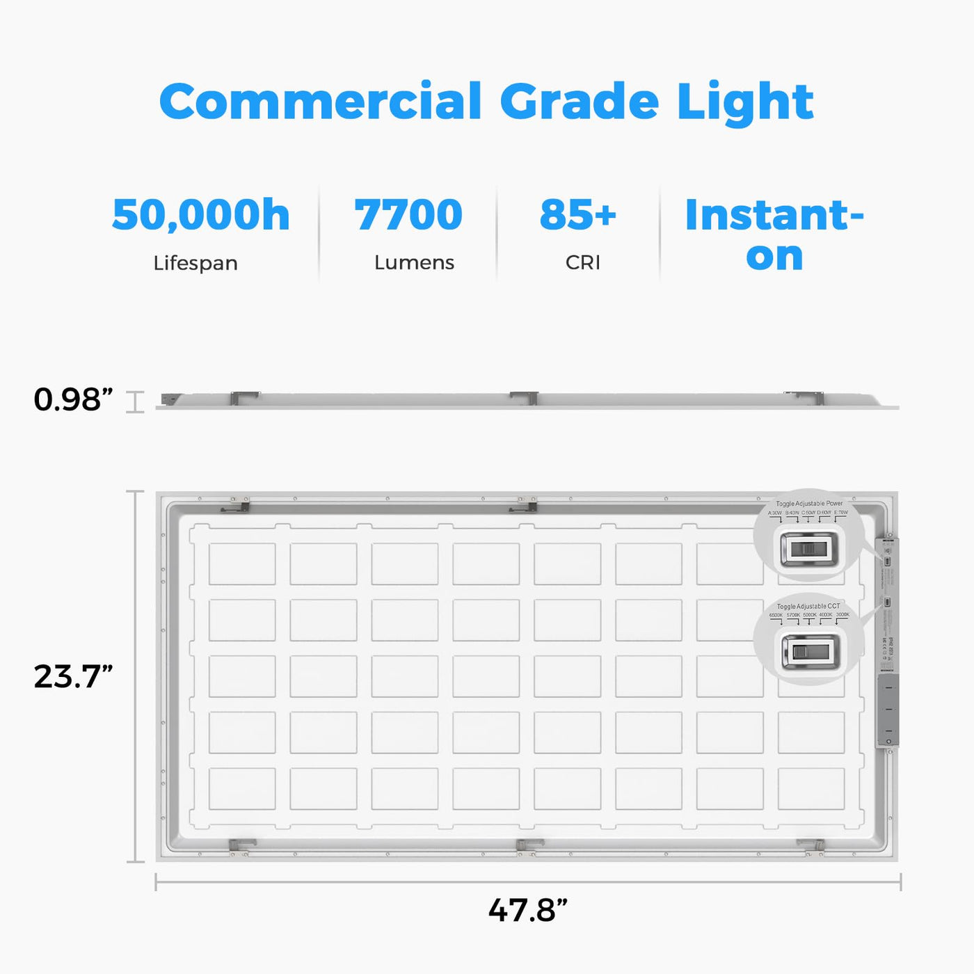 This LED panel light features power selectable technology, allowing you to choose between five wattage options ranging from 30W to 70W. The color temperature is adjustable from 3000K to 6500K, ensuring you can create the perfect atmosphere for any environment. With a remarkable output of 7700 lumens, this light achieves a high efficiency of 110 lumens per watt, providing bright illumination while helping to reduce energy costs.