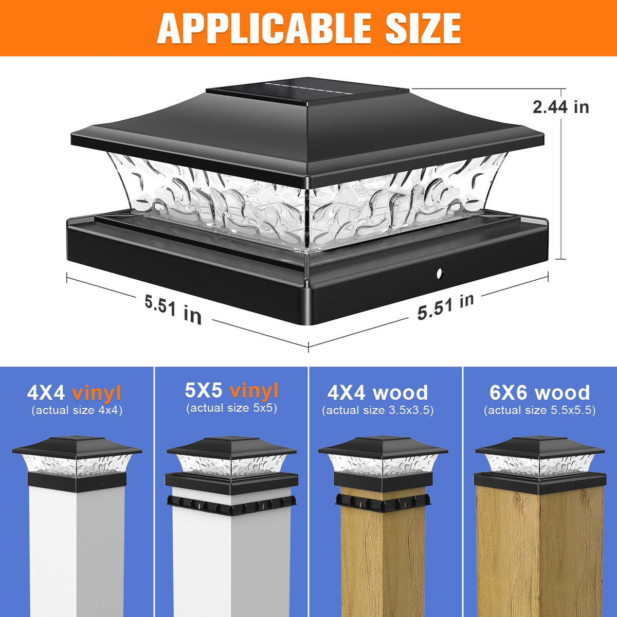 Q: Can these solar post cap lights be used on different sizes of posts?A: Yes, the APONUO solar post cap lights are designed to fit 4x4 and 6x6 wooden posts, as well as actual 4x4 and 5x5 vinyl posts. They come with screw fittings and three different sizes of bases for easy installation.