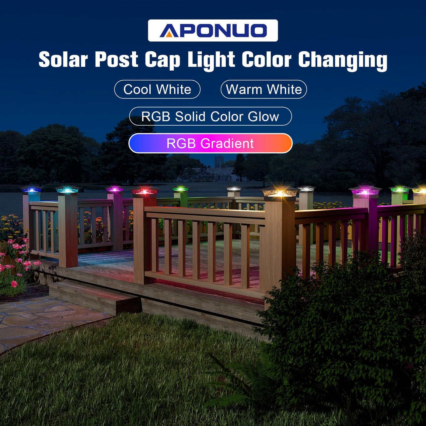 Q: What are the lighting modes available in the APONUO 4x4 post solar lights?A: The APONUO 4x4 post solar lights feature 4 lighting modes: warm white, cool white, RGB solid colors, and RGB gradient modes. You can easily switch between these modes to create the desired ambiance.