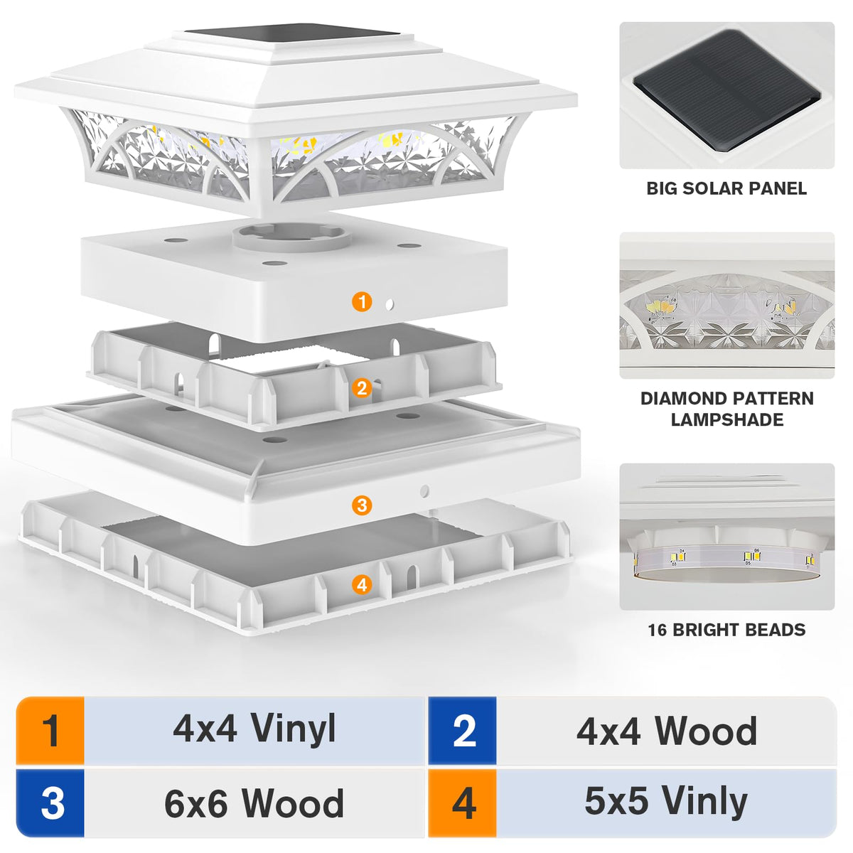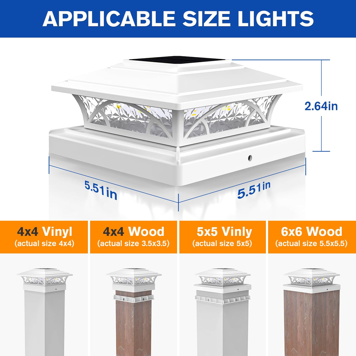 Q: What types of posts are compatible with these solar lights?A: The APONUO Solar Post Cap Lights are designed to fit 4x4 and 6x6 wooden posts, as well as 4x4 and 5x5 vinyl or plastic posts, making them versatile for different outdoor settings.