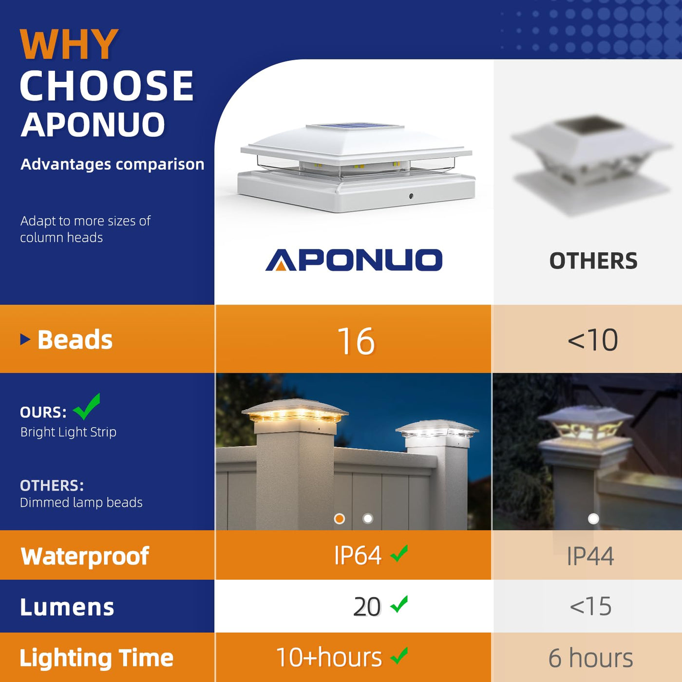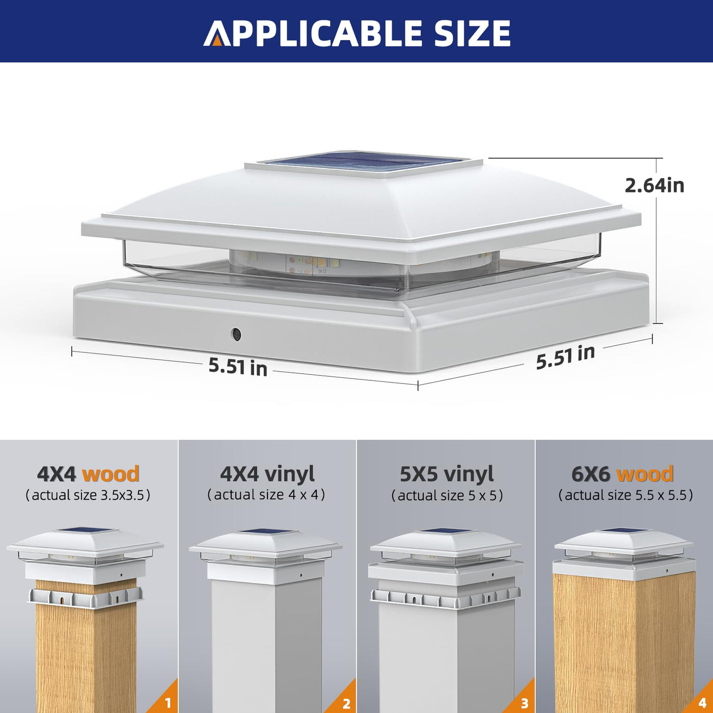 Q: What sizes of posts are compatible with the APONUO solar post cap lights?A: The APONUO solar post cap lights are designed to fit 4x4, 5x5, and 6x6 wooden and vinyl posts. The actual dimensions for compatibility are 3.5x3.5 inches for 4x4 posts and 5.5x5.5 inches for 6x6 posts.