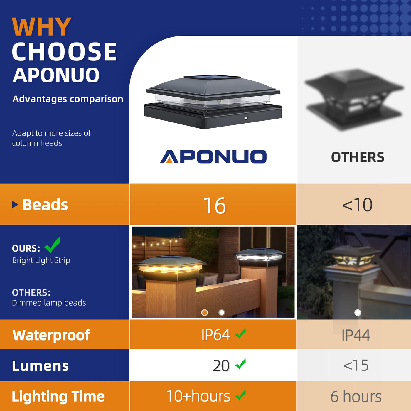 Q: How bright are the APONUO Solar Post Cap Lights?A: These solar post cap lights emit 20 lumens of bright light thanks to 16 LED beads. They feature two color modes: warm white and cool white, making them perfect for various outdoor lighting needs.