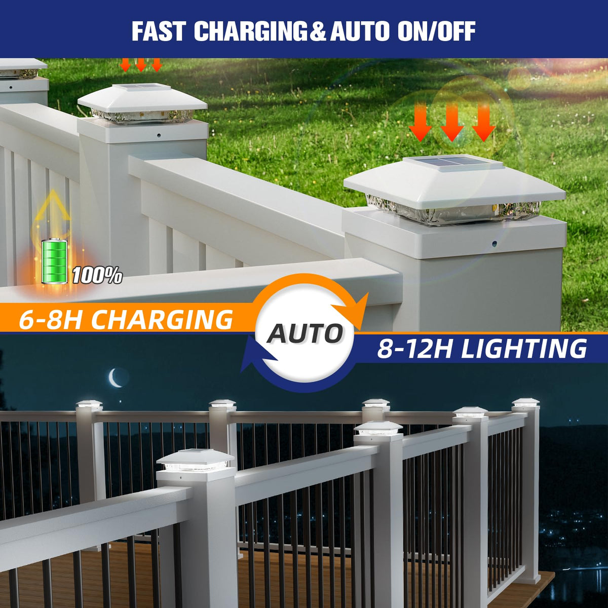Q: How long do the solar post cap lights stay illuminated?A: The high-efficiency solar panel charges the lights during the day and provides up to 12 hours of continuous illumination at night, ensuring your outdoor spaces remain lit after sunset.