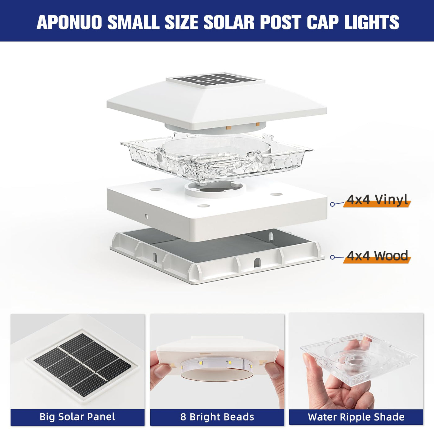 Q: What size posts are compatible with APONUO Solar Post Cap Lights?A: APONUO Solar Post Cap Lights are designed to fit 4x4 posts, which are typically 3.5x3.5 inches for wooden posts and actual 4x4 inches for vinyl posts. This ensures a perfect fit for most common post sizes.