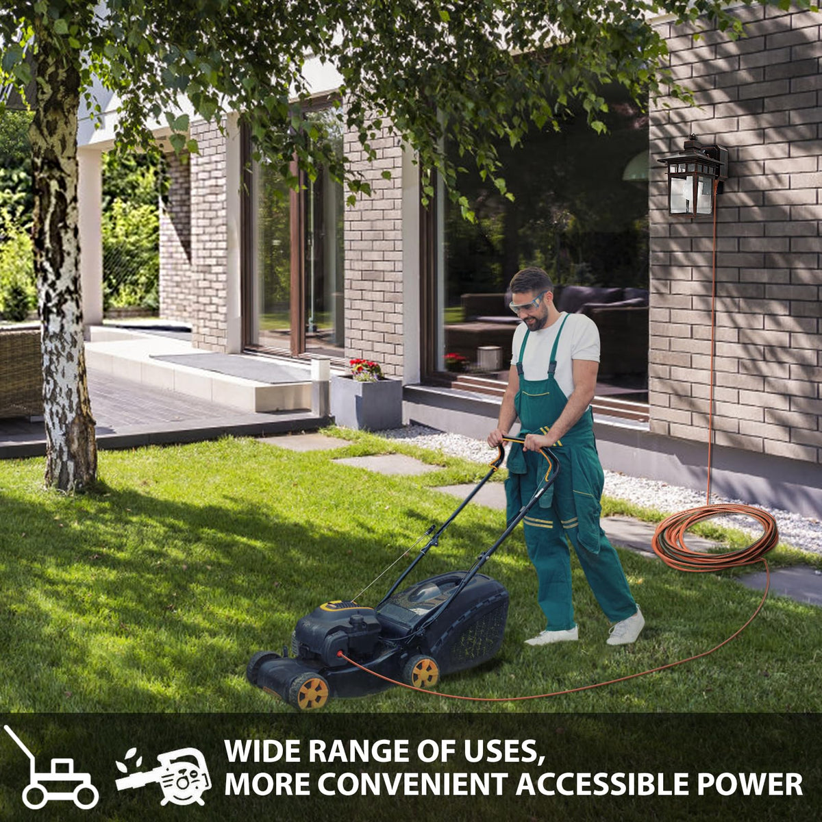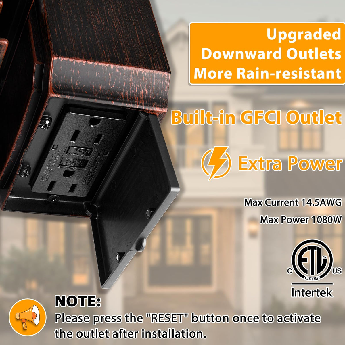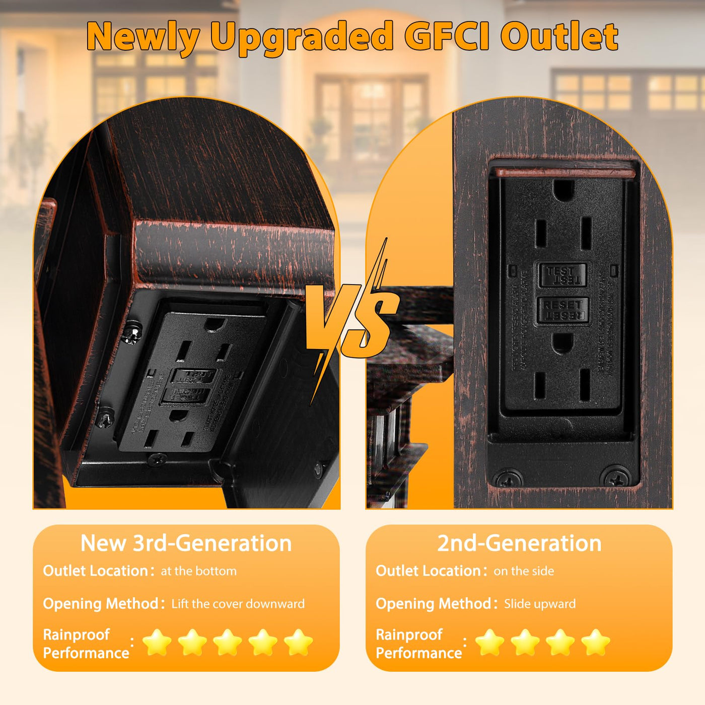 Q: What is the purpose of the GFCI outlet in the APOTO outdoor light?A: The upgraded GFCI outlet in the APOTO outdoor light provides safer power access for outdoor devices, protecting against electrical faults like surges and short circuits. It has two receptacles and is designed to guard against rain, making it ideal for outdoor use.