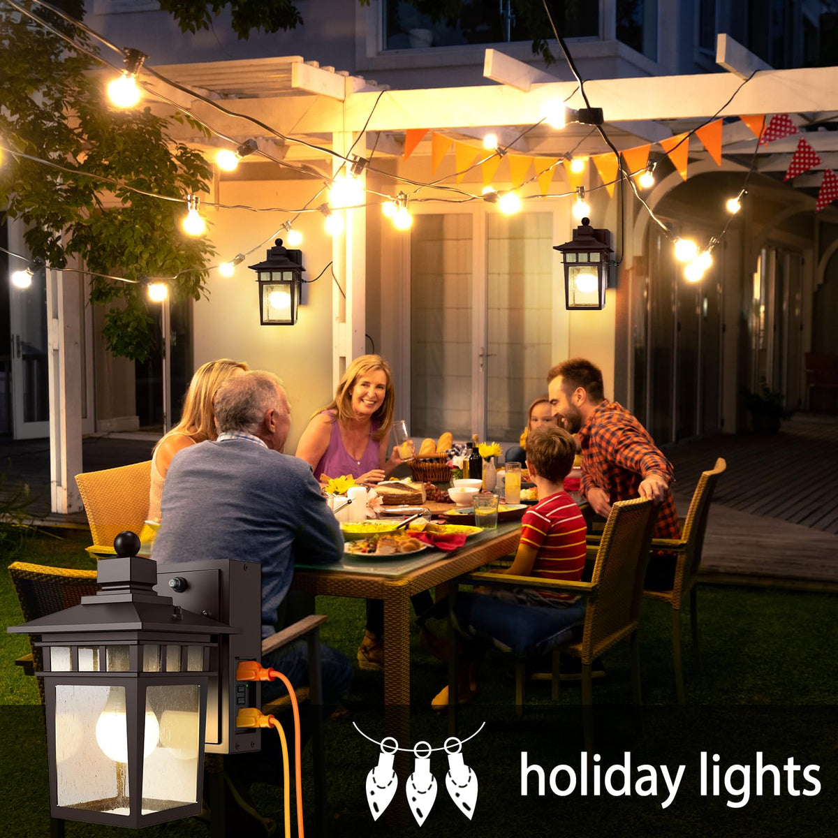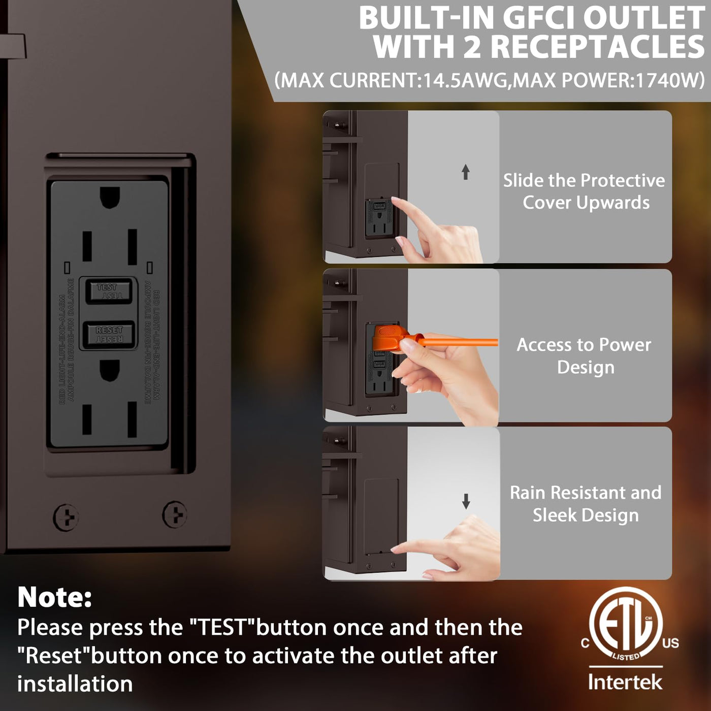 - **Built-in GFCI Outlet**: Equipped with a tamper-resistant design, this outdoor light includes a dual receptacle GFCI outlet, ensuring safe power supply for your 2-pin and 3-pin devices. Perfect for outdoor decor and equipment with a maximum current of 15A.