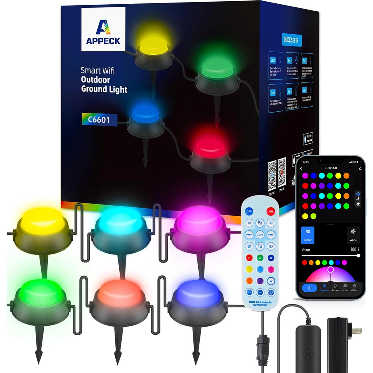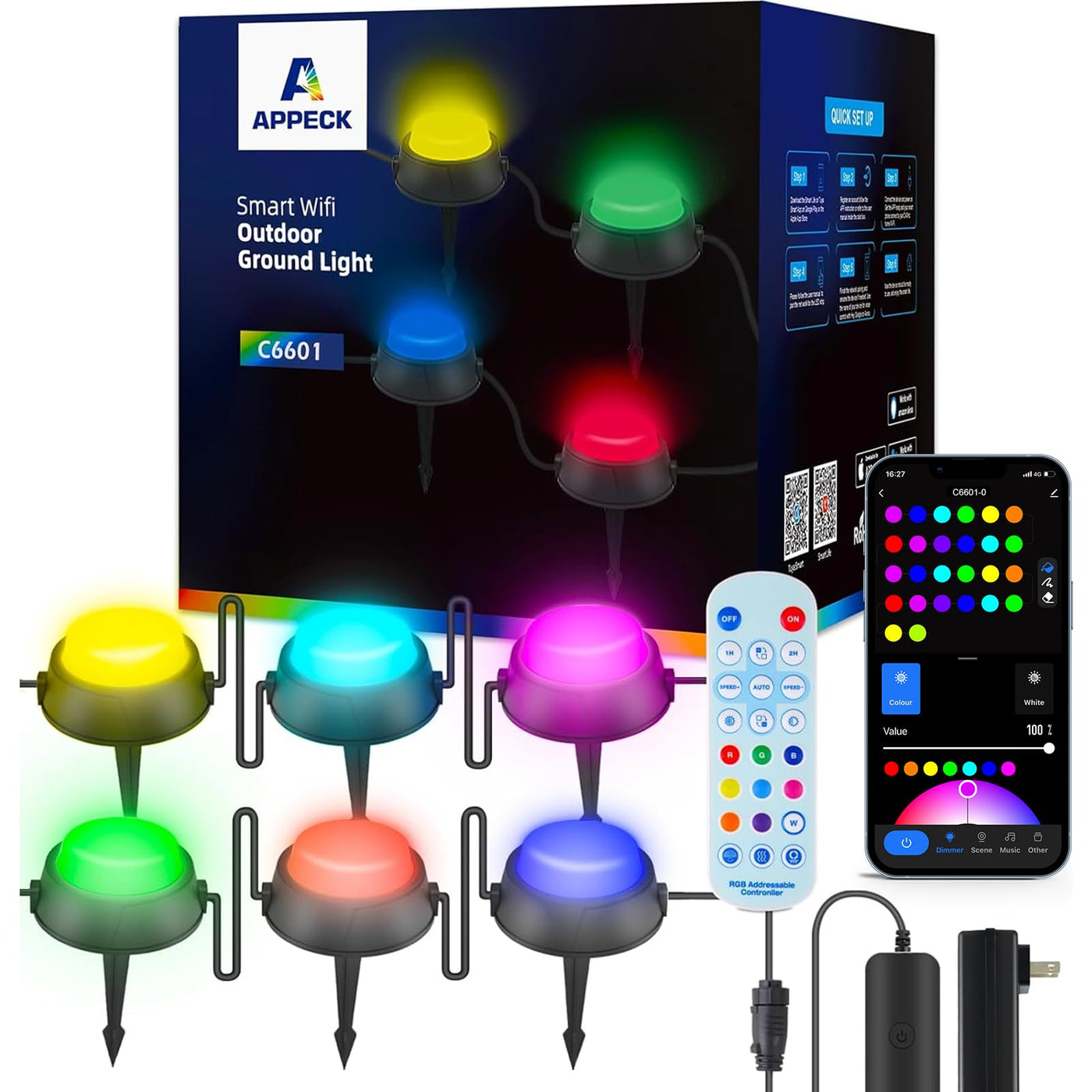Q: How can I control the lighting effects of the APPECK Ground Lights?A: You can control the lights using the 'Smart Life' app on your smartphone, through voice commands via Alexa (supports 2.4GHz Wi-Fi), or with a remote control, making it easy for everyone to enjoy.