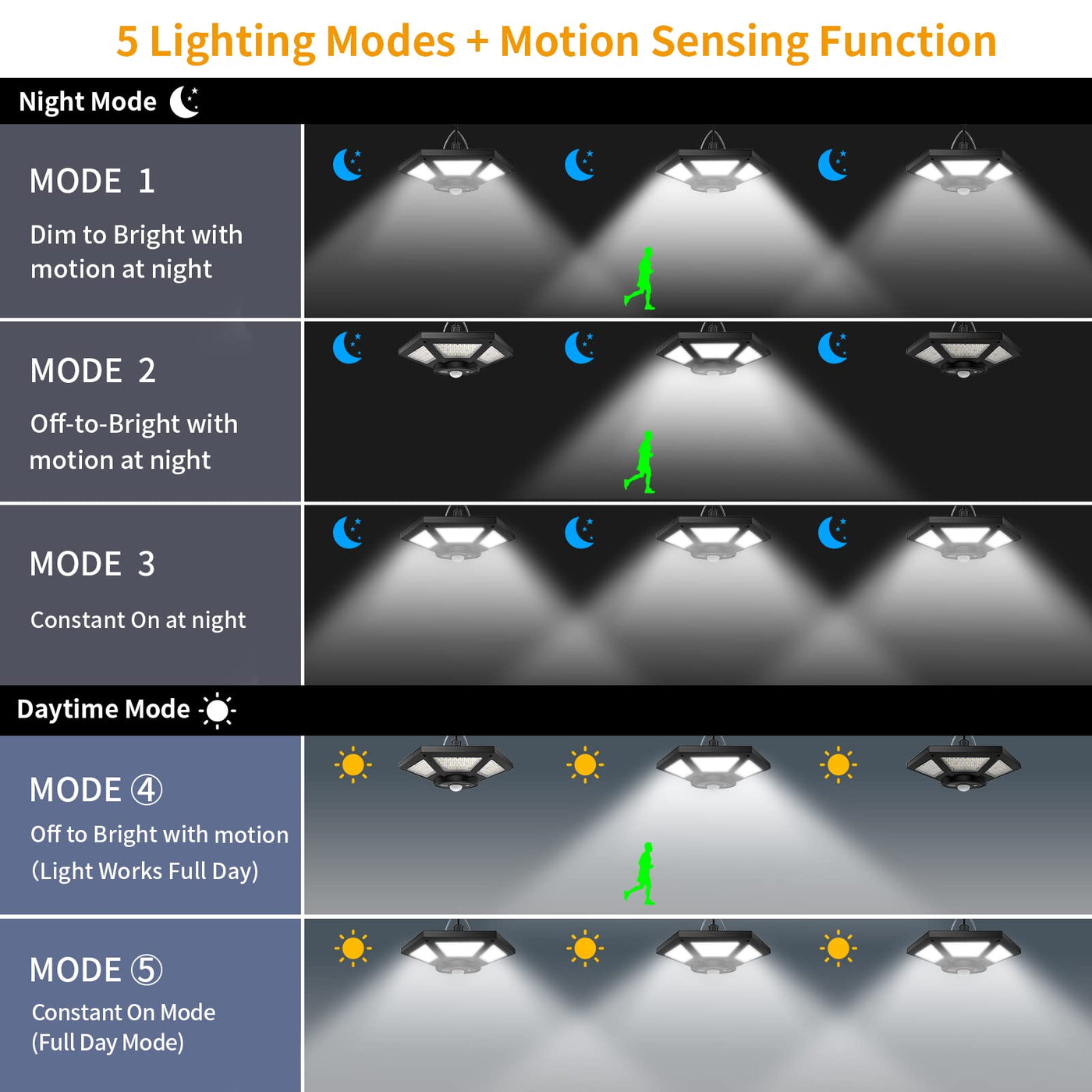 Q: How does the motion sensor work in the solar shed light?A: The motion sensor detects movement and activates the light according to the selected mode. For instance, in nighttime modes, it can switch from dim to bright when motion is detected, ensuring efficient energy use.