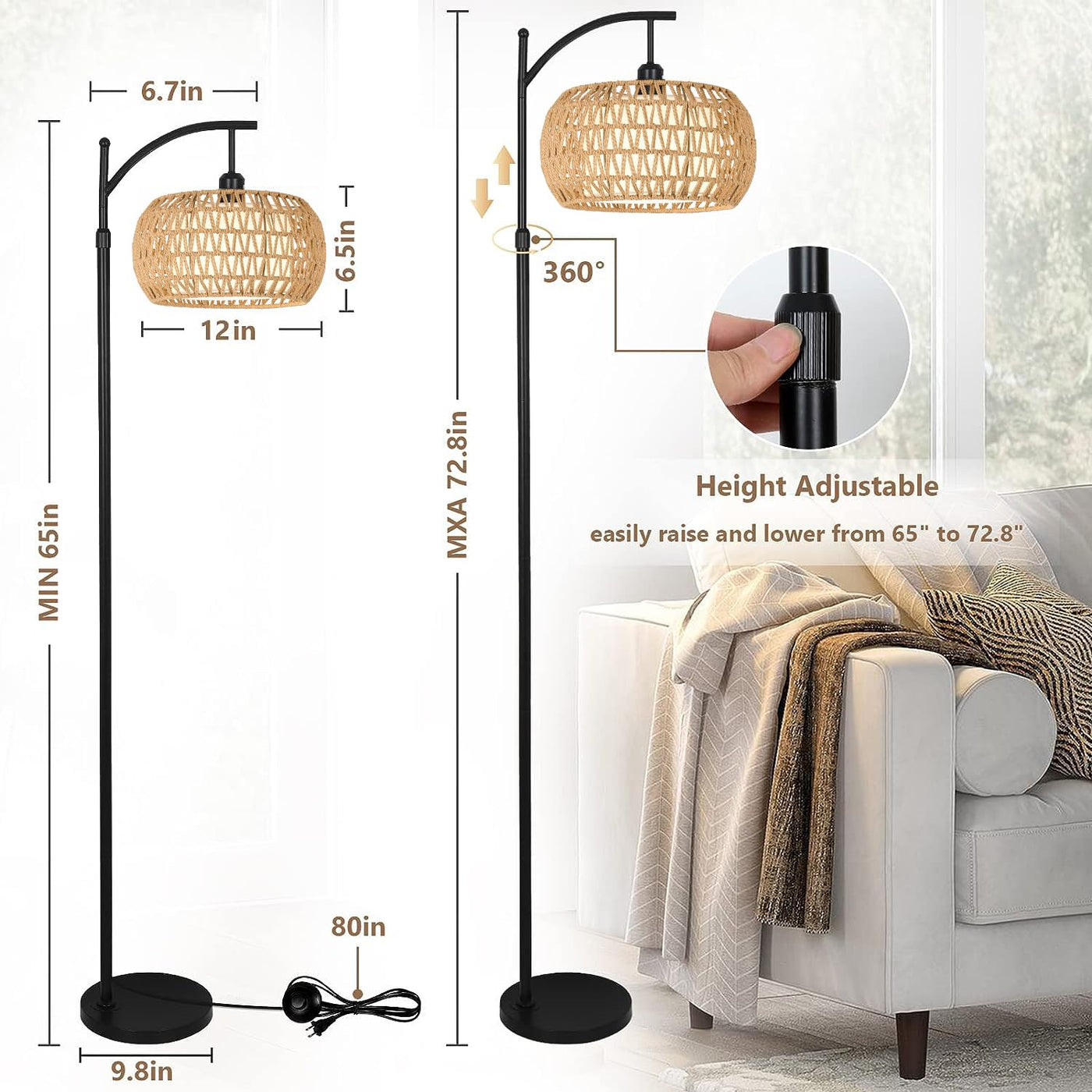 Arc Floor Lamp For Living Room Rattan Boho Floor Lamp With Remote Control,Dimmable Led Floor Lamp Wicker Lamp Shades Black Stand