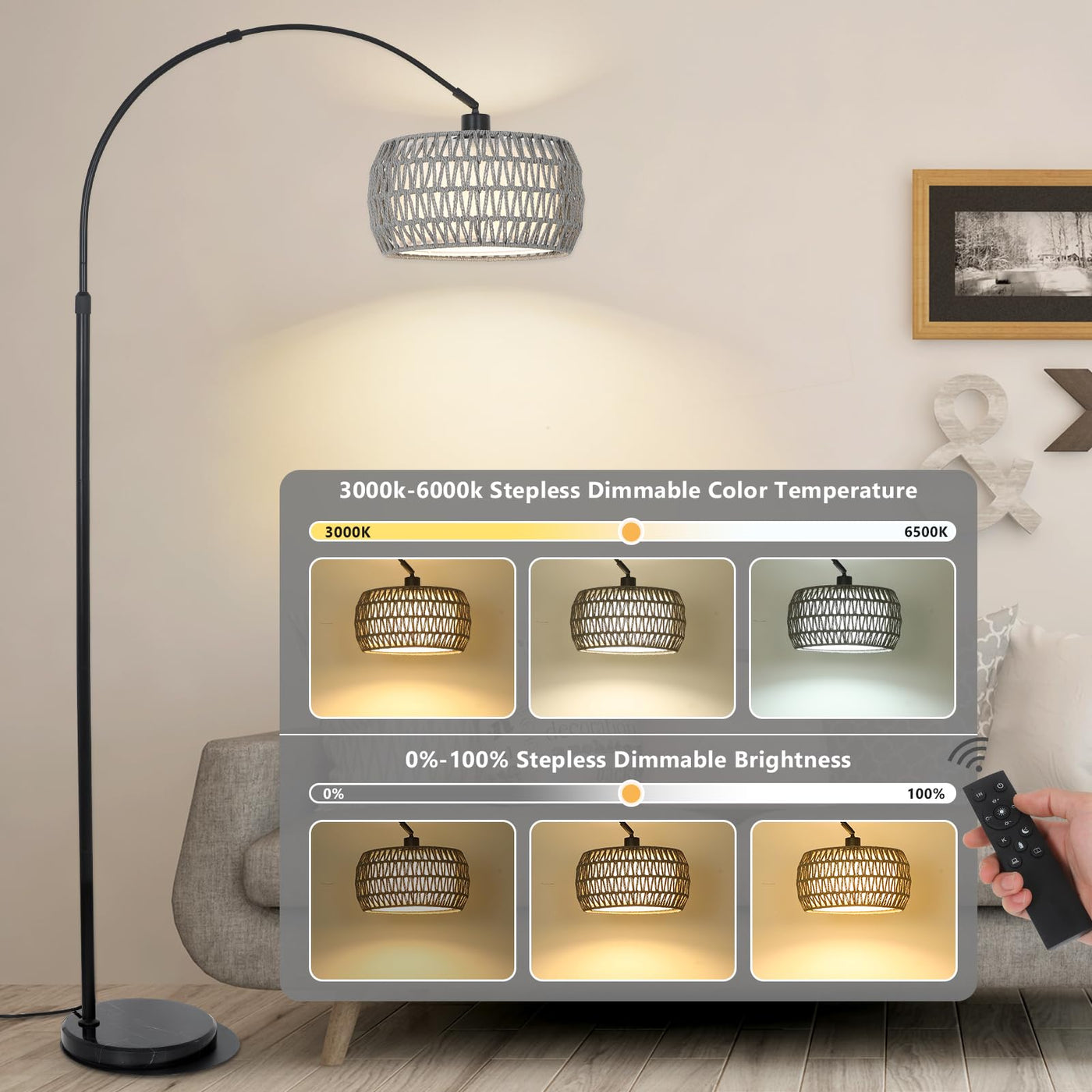 Arc Standing Lamp, Boho Floor Lamps For Living Room With Remote And Led Dimming Bulb, Rattan Tall Lamp For Bedroom With 3 Color