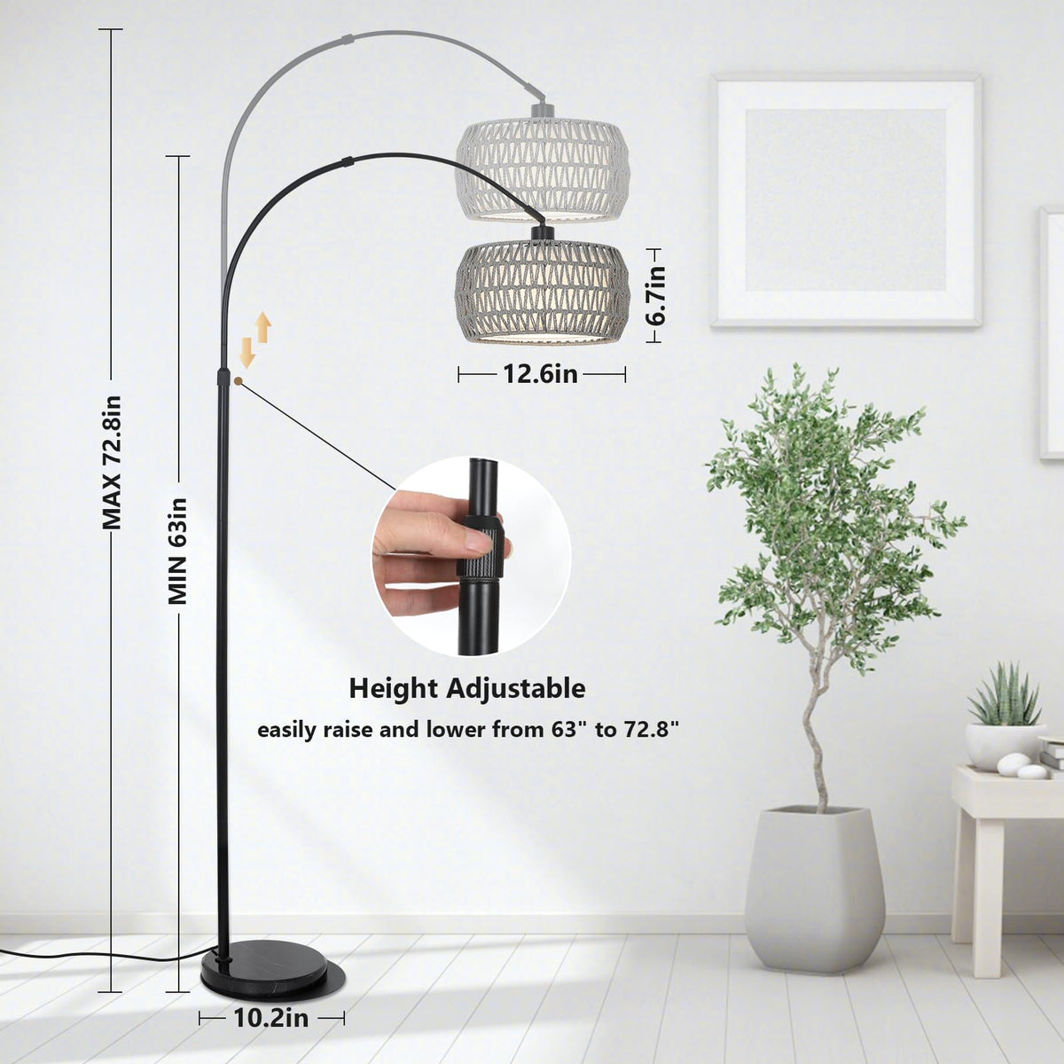 Q: Is the height of the lamp adjustable?A: Yes, the height of the Arc Standing Lamp is adjustable between 62 inches and 72.8 inches, making it versatile for various room configurations and user preferences.