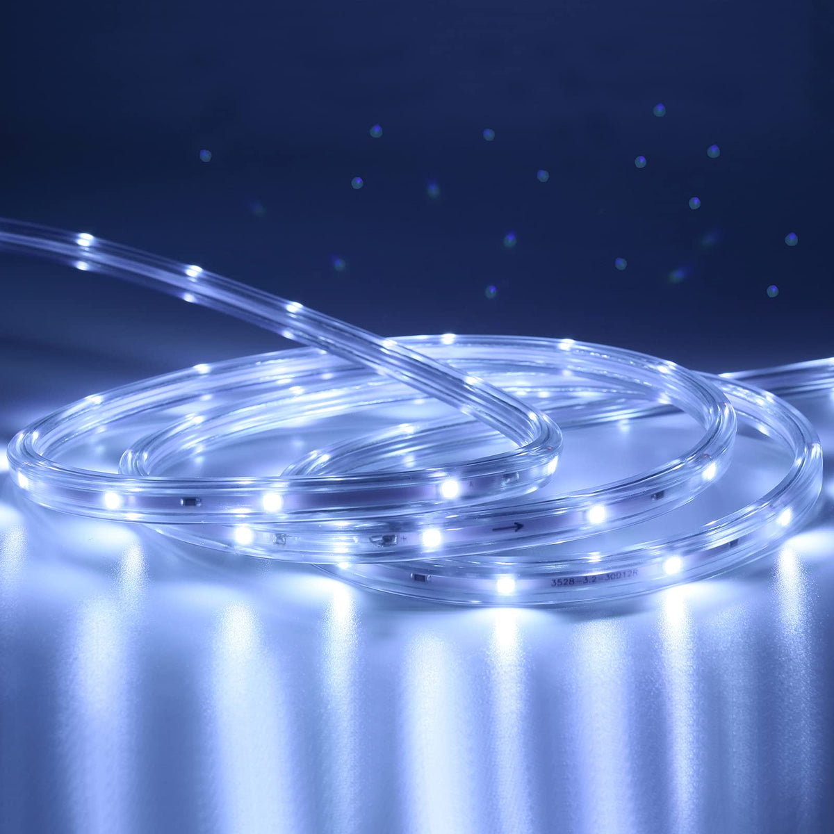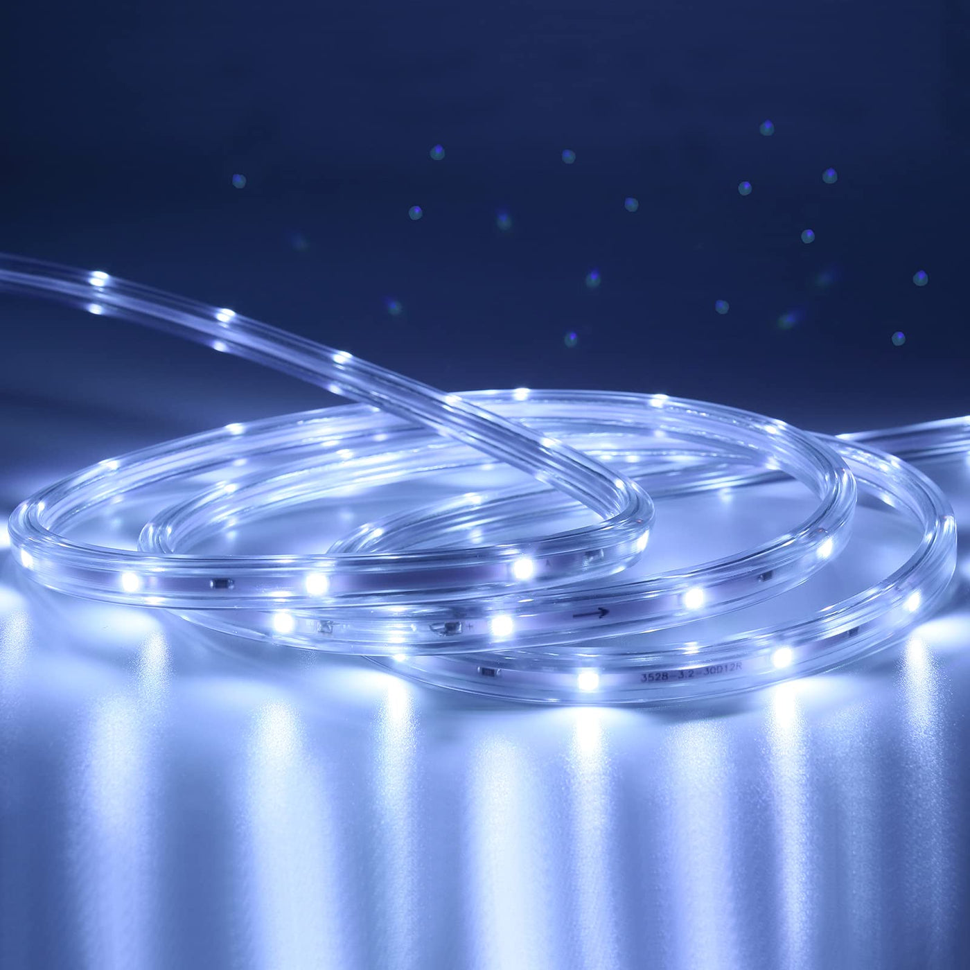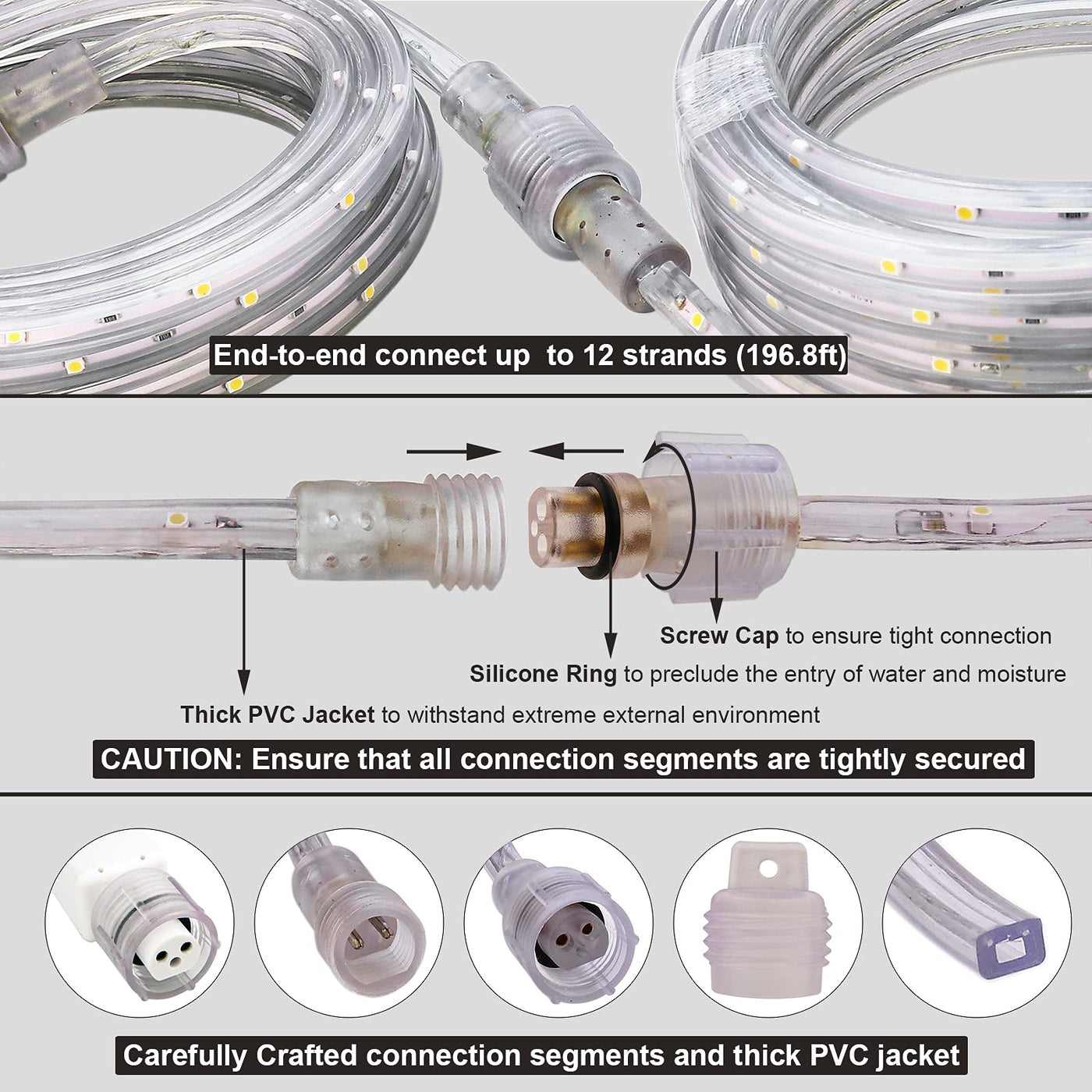 FLEXIBLE AND BENDABLE: This LED rope light is flexible enough to be bent into different shapes to meet your DIY needs. Ideal decoration lights for building outlines, plants, Christmas trees etc. LONG ENOUGH: This strip light is an extendable unit. You can link up to 12 strands together. The maximum length is 196.8ft, long enough to meet your creative décor needs. WATER RESITANT: Thanks to the carefully crafted connection segments and thick PVC casing, this rope light can resist water splashing, perfect for indoor and outdoor use. NOTE: Ensure all the connection segments are tightly secured. EASY INSTALLATION: The rope lights come with connectors and mounting accessories. You can easily connect and mount them.