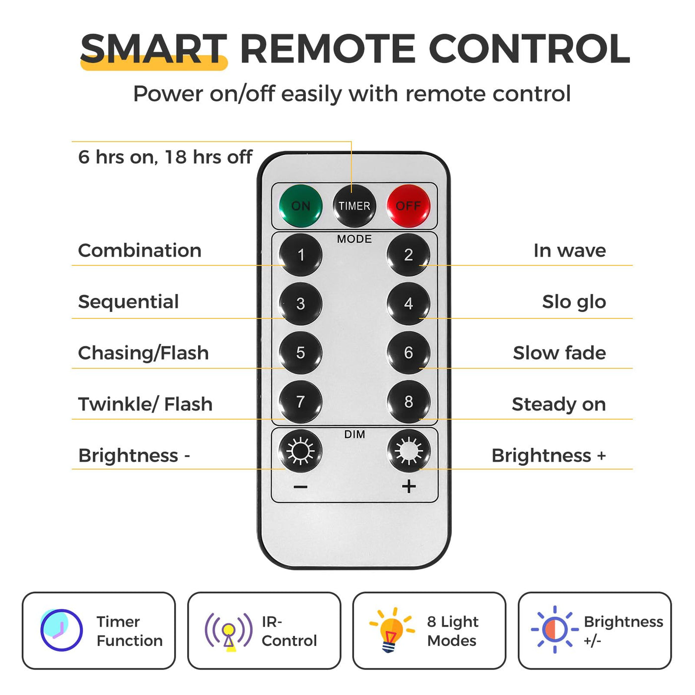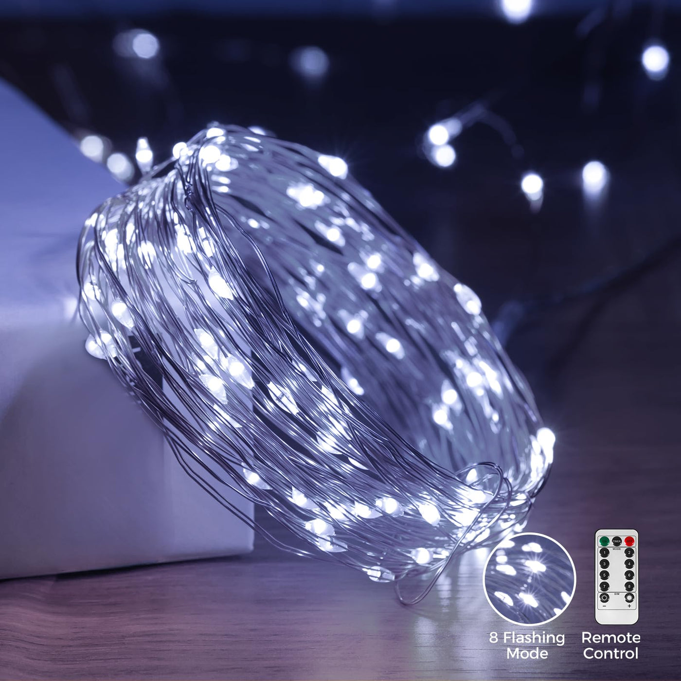 Versatile 8 Lighting Modes - Includes combination, wave, sequential, slow fade, chasing flash, slow glow, flash, and steady on modes. | Remote Control & Timer - Easily turn lights on/off, adjust brightness, and select modes with the remote; set a timer for automatic shut-off. | Energy-Saving & Long-lasting - High quality copper wire ensures low power consumption and long lifespan. | Waterproof & Flexible Design - Waterproof and bendable wire for indoor/outdoor use and creative decoration. | USB Powered - Convenient USB plug works with any USB port, including those on computers, laptops, and phone chargers.