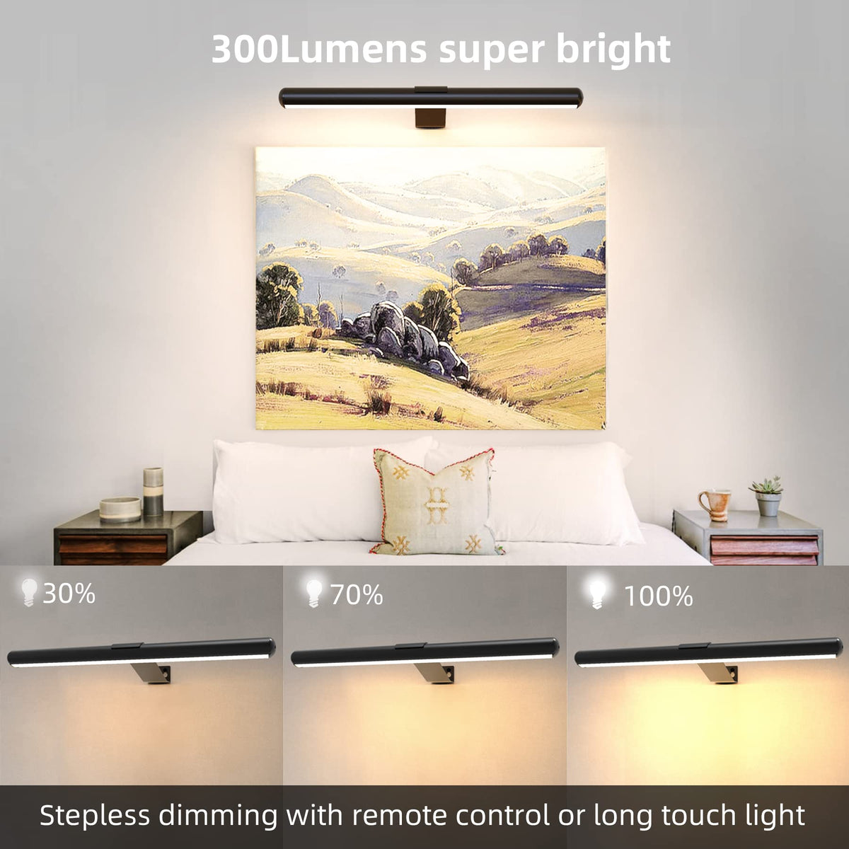 Specifications: Lumens: 300 LM Run time: 20 Hours Power Source:4000mAh recharge battery(included) Color Temperature: Warm White (3000K), Nature White (4300K),Cool White (6000K) Lifespan: 80000 Hours Wattage: 2W Voltage of Light: DC 5V Package: 1*Picture Light 1*Remote 1*Tpye-C USB charging cable 1*User manual 2*Screws Dimmable and Soft 3 Brightness Modes: Adjust ''10%'' ~ ''100%'', Warm White(3000K) and Nature White (4300K),Cool White (6000K) by Remote Controller. Timer Preset Turn OFF : Freely Set Timer with 15, 30, 60, and 120 Minutes. You can save more battteries power . 365 days after sale service, any question ,welcome to contact us via amazon.