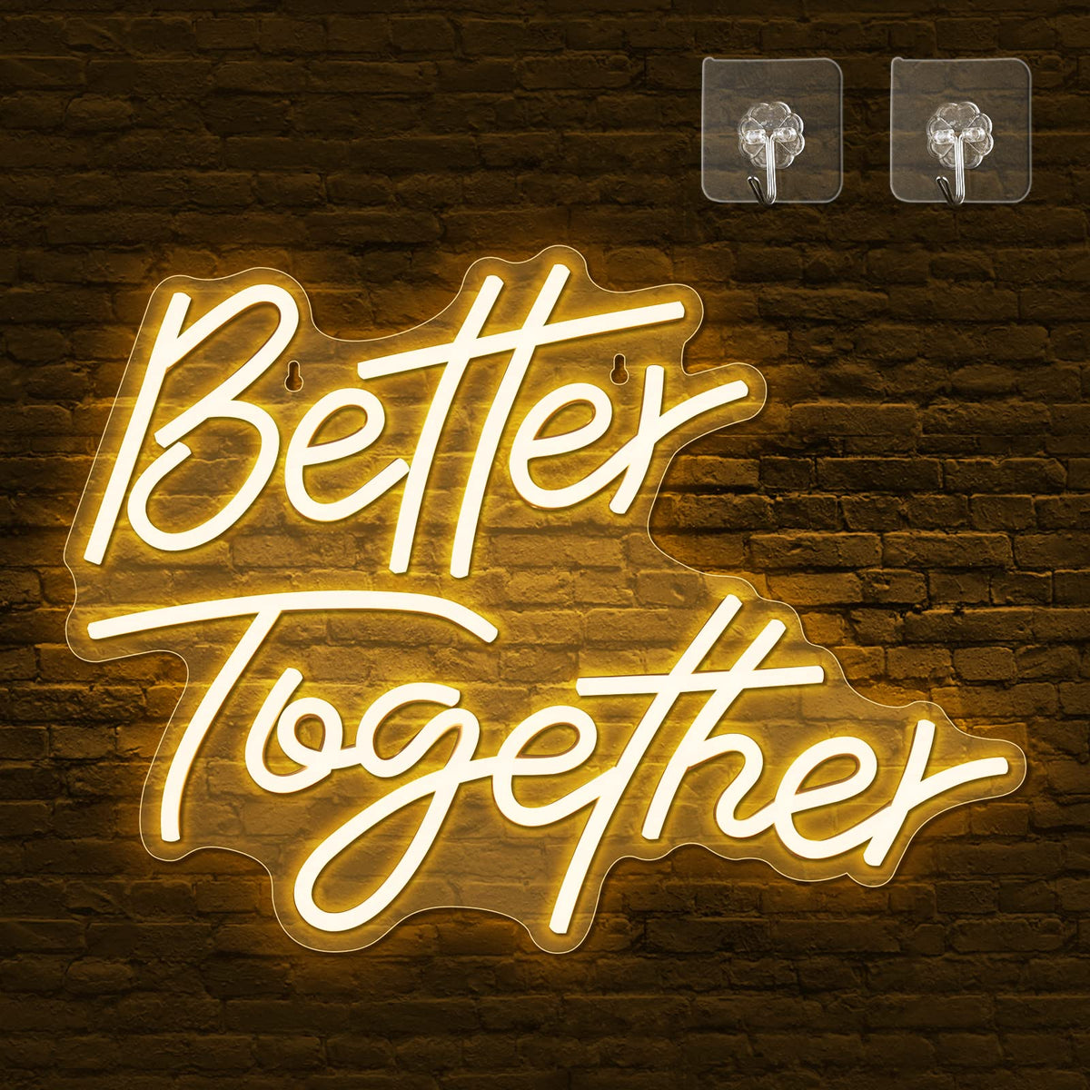 - **Easy to Use and Install**: The Better Together neon sign comes with a convenient on/off switch and can be powered through a USB connection. Compatible with power banks, phone chargers, and computers, it can be easily hung on walls using the included hooks, making installation a breeze.