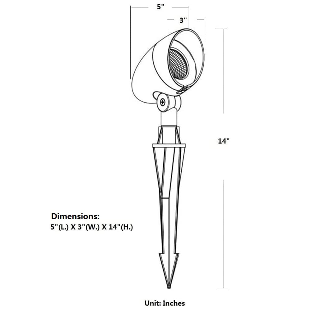 Outstanding Specifications: -. Heavy duty cast aluminum low voltage landscape spotlights 8 watts,equivalent to 60 watts halogen bulb -. Name brand COB led chip equipped,color rendering index over 85,clear tempered glass cover -.Spread beam angle 35° -.Inside "O"ring construction for water resistant function.Normally working temperature from -4°F to 115°F -.Working low voltage 12V AC/DC. And 3 feet UL listed 18AWG SPT-1 leading wire with prepared end -.Weatherproof IP65 rating,suitable for outdoor damp locations Tempered clear glass cover Rotation 270° ensures the lighting directions that users wanted -.Solid aluminum body corrosion resistant,with heavy duty ground spike