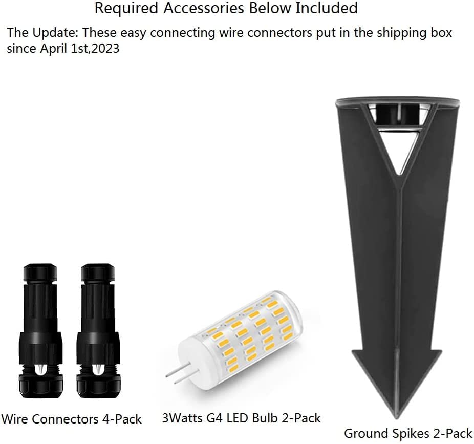 Package Including: 2 x pack path lighting fixtures 2 x pack bi-pin G4 led bulb warm white 2 x pack plastic ground spike 1 x pack Installation Instruction Sheet