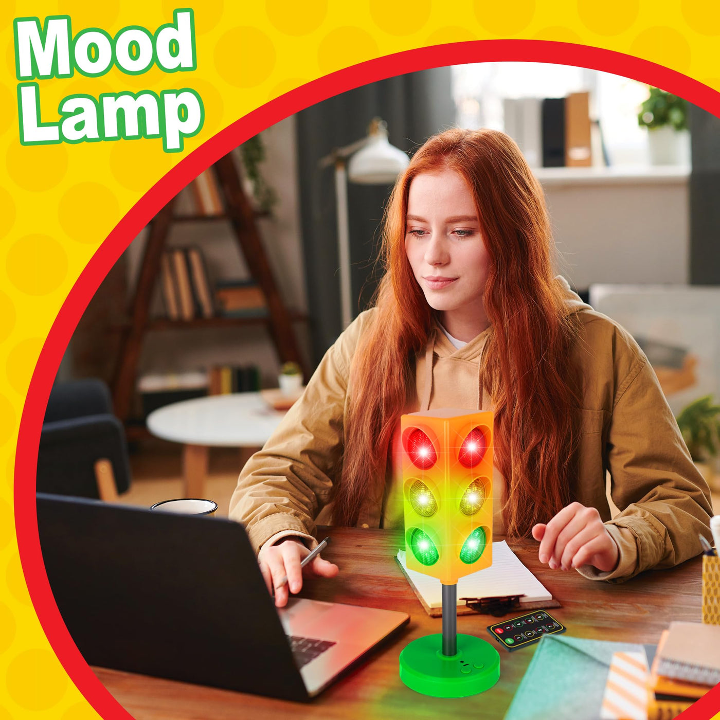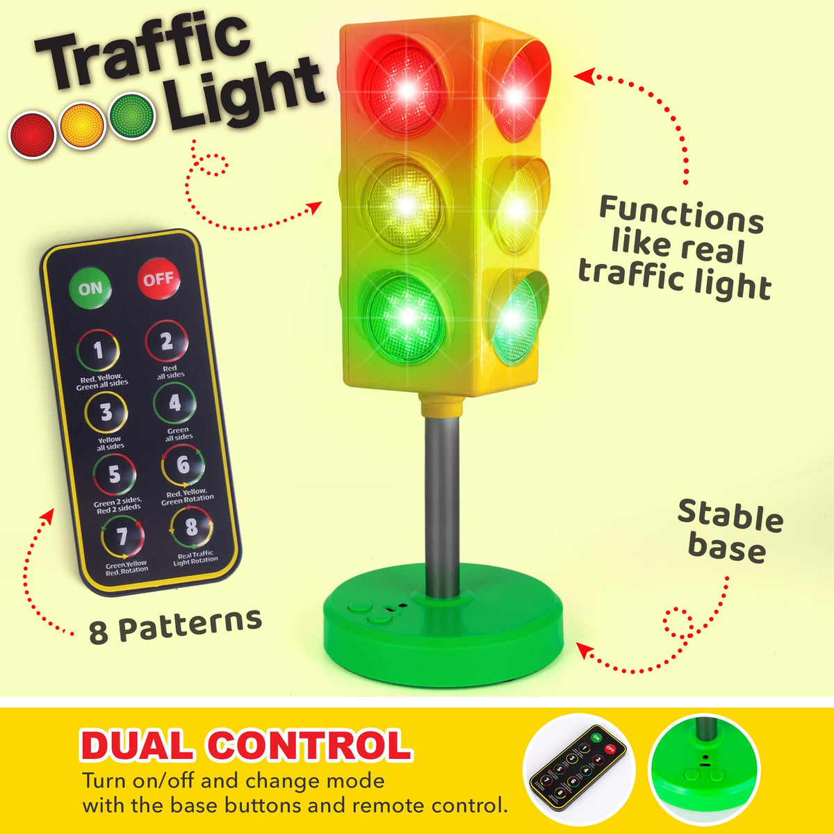 TRAFFIC-STOPPING GOOD LOOKSMake a StatementLighting that will have car aficionados smiling! We set out to create a table lamp that little car lovers would adore. A night light for kiddos that cant seem to get enough of racecars, trucks, and all things speed. And thanks to this traffic light lamp, we did just that! It grabs attention at first glimpse with its yellow construction and classic shape. But plug it in, turn it on, and it properly steals the show. Red, green, and yellow LEDs light up in a number of patterns to spruce up any room. Use the included remote or the controls on the light itself to pick a light pattern, stand back, and soak up the beauty.Great Gift IdeaShopping for a birthday gift that will make that special day one to remember? A holiday present that promises nothing but grins? This traffic light lamp is just what you need to blow anyone away! Its great for boys and girls and also works as bedroom or classroom decor. To power it on, simply plug in the USB-C cable provided, attach it to a wall adapter, and illuminate the room with mesmerizing color.Heres why youll love this traffic light lamp:- Features bright red, yellow, and green LEDs.- The classic design makes it great for room decor.- Comes with a wireless multifunction remote.- Has 8 different light-up patterns for eye-catching variety.- Conveniently powered via USB-C (cable provided).- Makes a great addition to classrooms and playrooms.Go ahead, give that little car lover something to smile about!