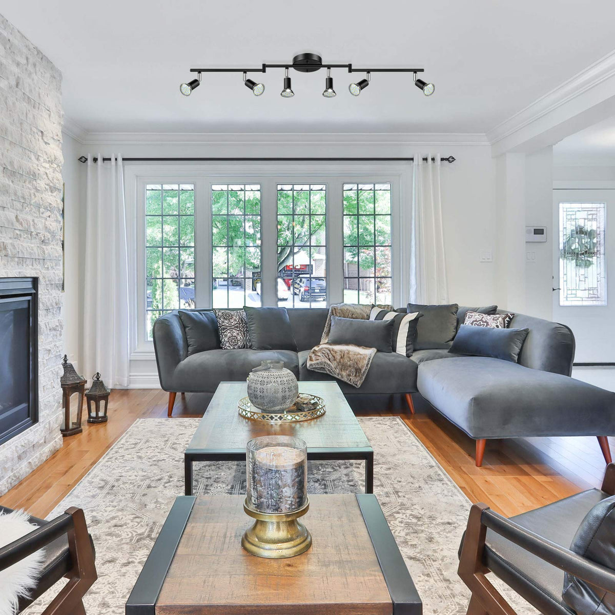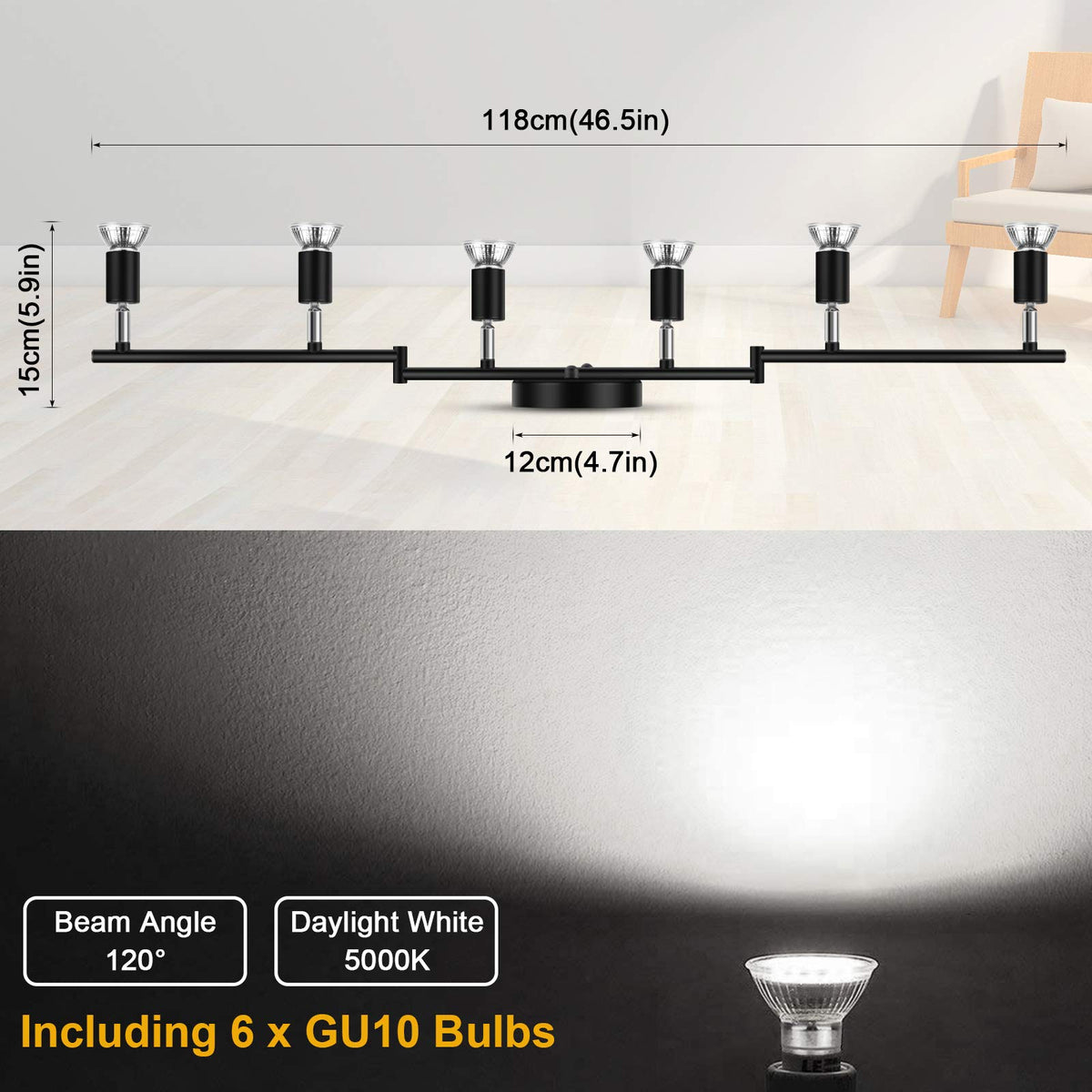 Multi-Directional Ceiling Spot Lights Fixture. The Tracking Light Is Very Flexible In Adjustment. Mult-Angle Adjusted, You Can Adjust The Lights And Arms To Different Angles, Including A V Shape, Side To Side And Up And Down. Adjustable Track Heads, This 6-Way Ceiling Track Light Can Be Rotated 90? Vertically And 330? Horizontally, Providing Wide Lighting Angle To Satisfied Your Different Requirements. Durable Material, The Ceiling Spotlight Made Of Metal Can Be Efficient Heat Dissipation. Black Finish To Prevent Rust And Will Be More Durable. Notice: Before Purchase, Please Read The Detailed Dimensions Of The Light Fixture. Length: 46.5''. Height: 5.9''. Dimensions Of The Base: 4.7''. Finish: Black Finish. Light Head: 6-Way. Material: Metal. Bulb Socket: Gu10 Max. Wattage: 50 W (Each Head). Voltage: 120 V Ac. Package Content: 1 X 6-Lights Led Track Light; 6 X Gu10 Led Bulbs 4 W Daylight White 5000 K; 1 X User Manual.