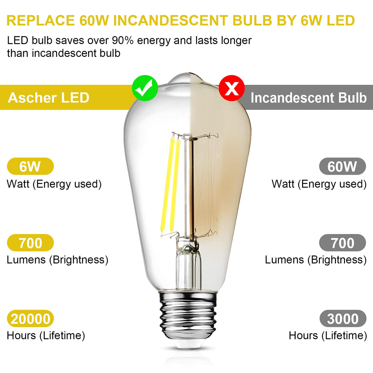 Ascher Vintage Led Edison Bulbs, 6W, Equivalent 60W, Non-Dimmable, Daylight 5000K, 700Lumens, St58 Antique Led Filament Bulbs Wi