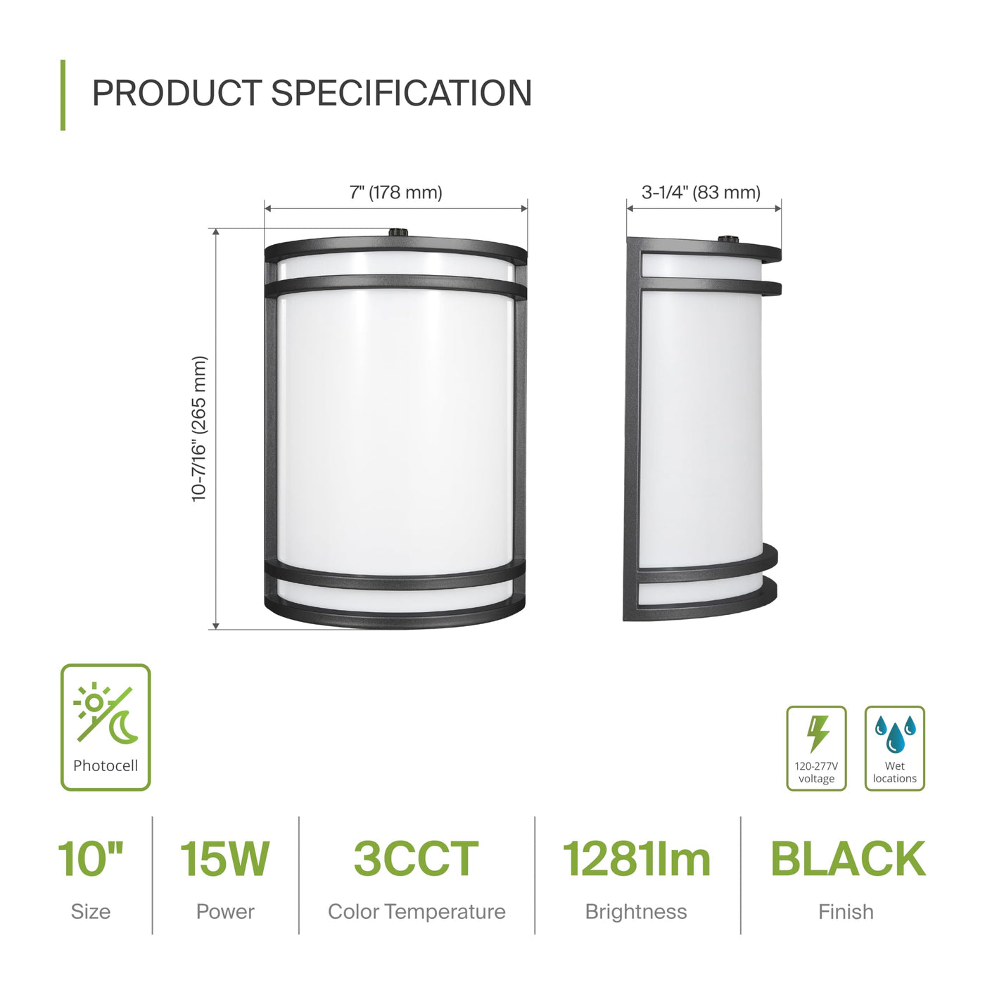ASD 10 Inch LED Dusk to Dawn Outdoor Wall Mount Light Fixture - Matte Black Modern Wall Sconce Lighting with Photocell - 120-277