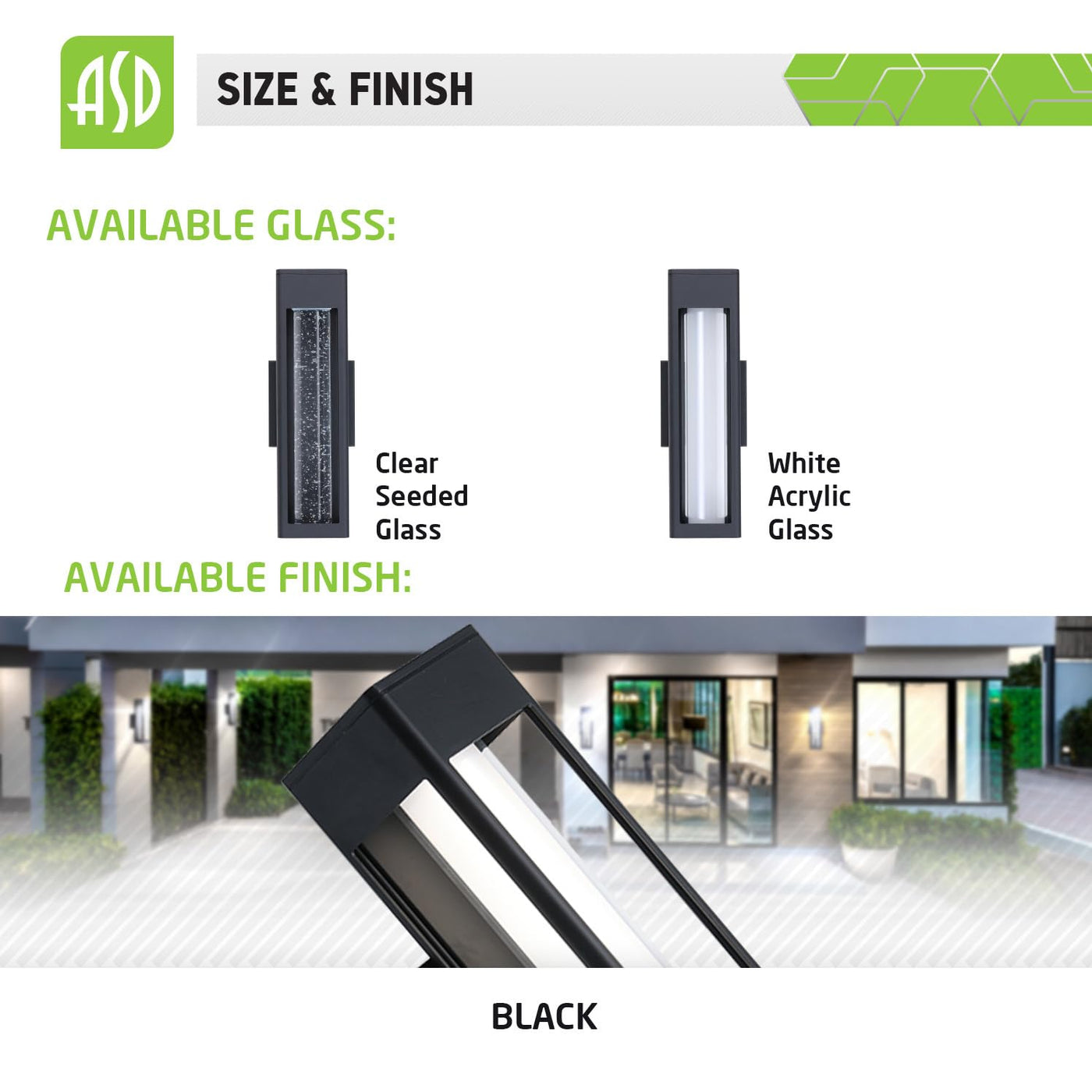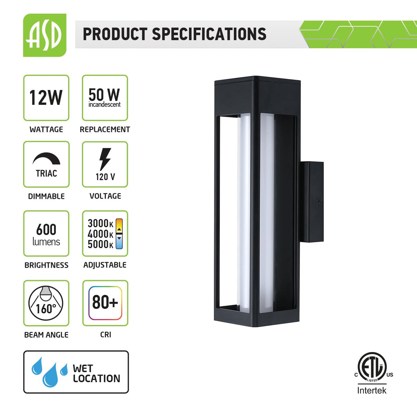 Q: What is the brightness and energy efficiency of the ASD LED 14 Inch Front Wall Light Fixture?A: The ASD LED 14 Inch Front Wall Light Fixture has an integrated energy-efficient 12W LED strip that provides 600 lumens of brightness, equivalent to a 50W incandescent bulb. It is designed for long life with a lifespan of over 50,000 hours.