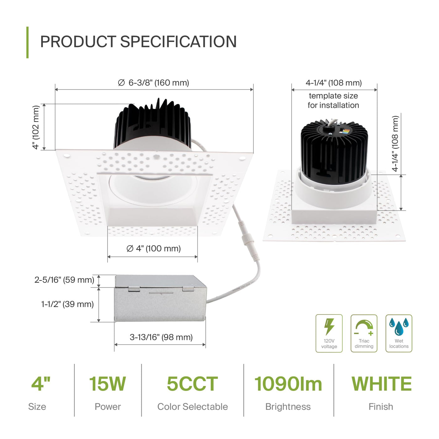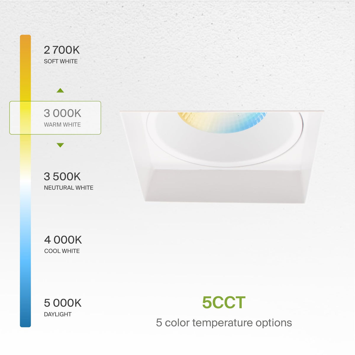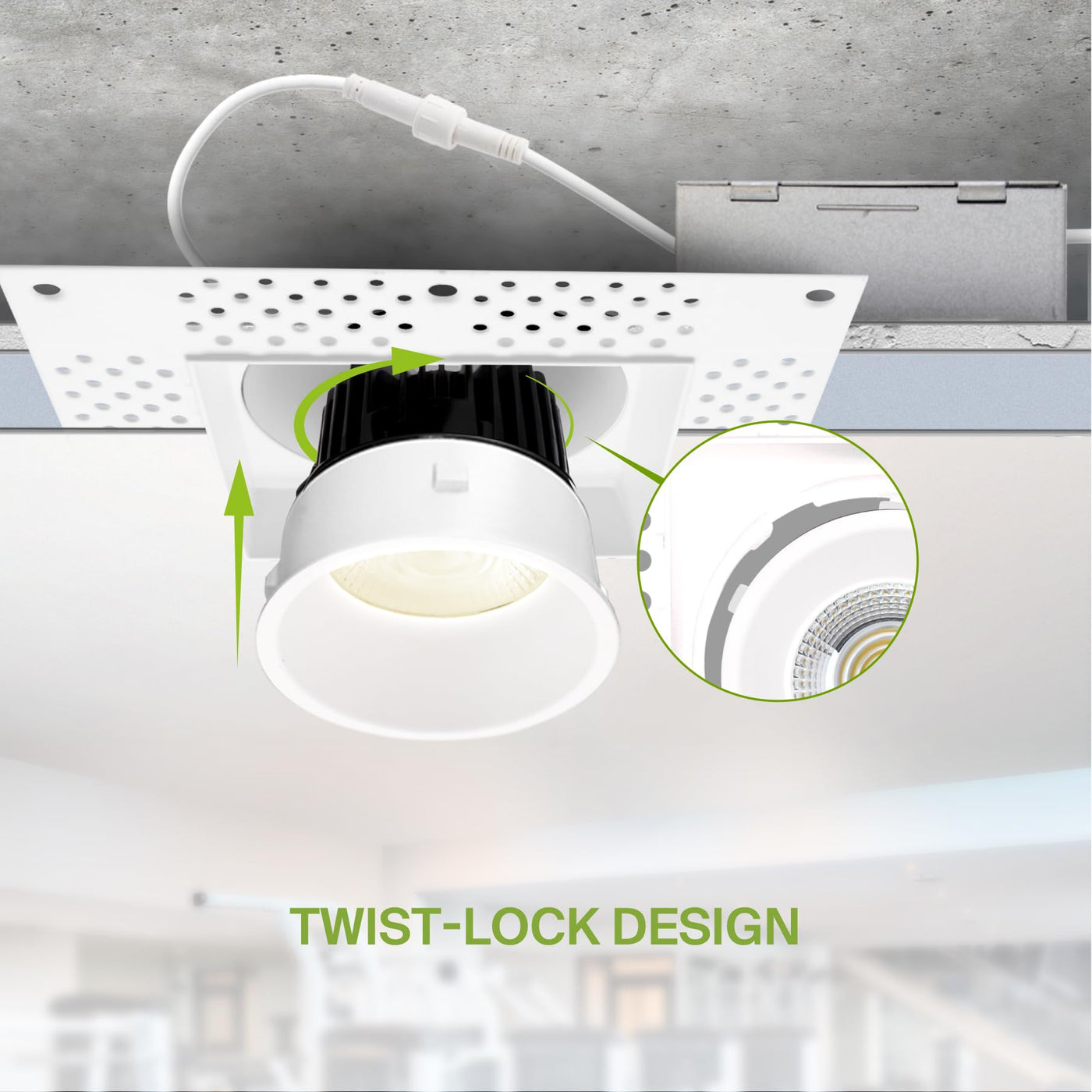 - **Elegant Trimless Design**: Featuring a twist-lock design with a square mud frame, this LED recessed light achieves a smooth, seamless look, perfect for contemporary interiors. The durable airtight aluminum housing ensures resilience and longevity.