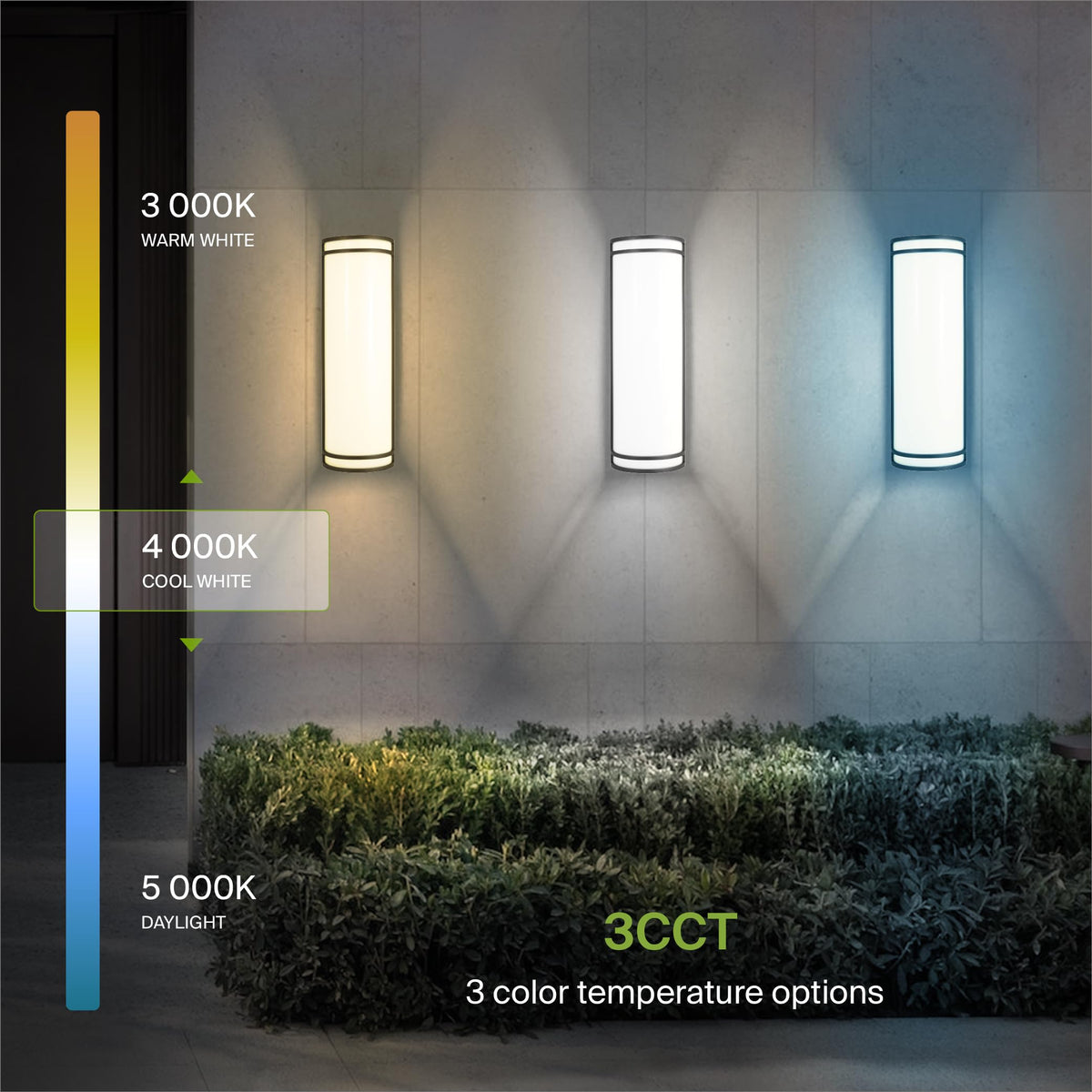 Q: What are the different color temperatures available for the ASD 18 Inch LED Outdoor Wall Mount Light Fixture?A: The ASD 18 Inch LED Outdoor Wall Mount Light Fixture offers three color temperature options: 3000K Warm White, 4000K Cool White, and 5000K Daylight. You can easily switch between these settings to suit your outdoor lighting needs.