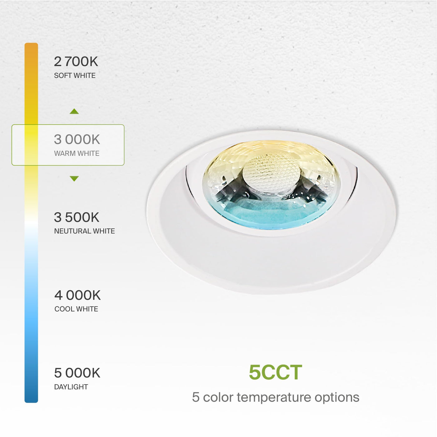 Q: What color temperatures are available for this LED recessed light?A: You can choose from five different color temperatures: 2700K soft white, 3000K warm white, 3500K neutral white, 4000K cool white, and 5000K daylight, allowing you to customize the lighting to fit your needs.