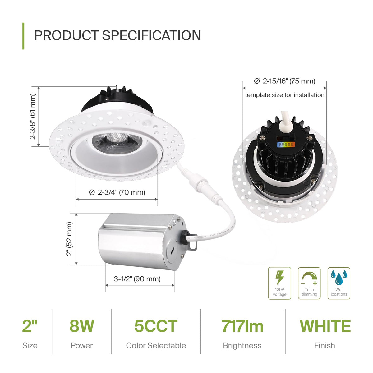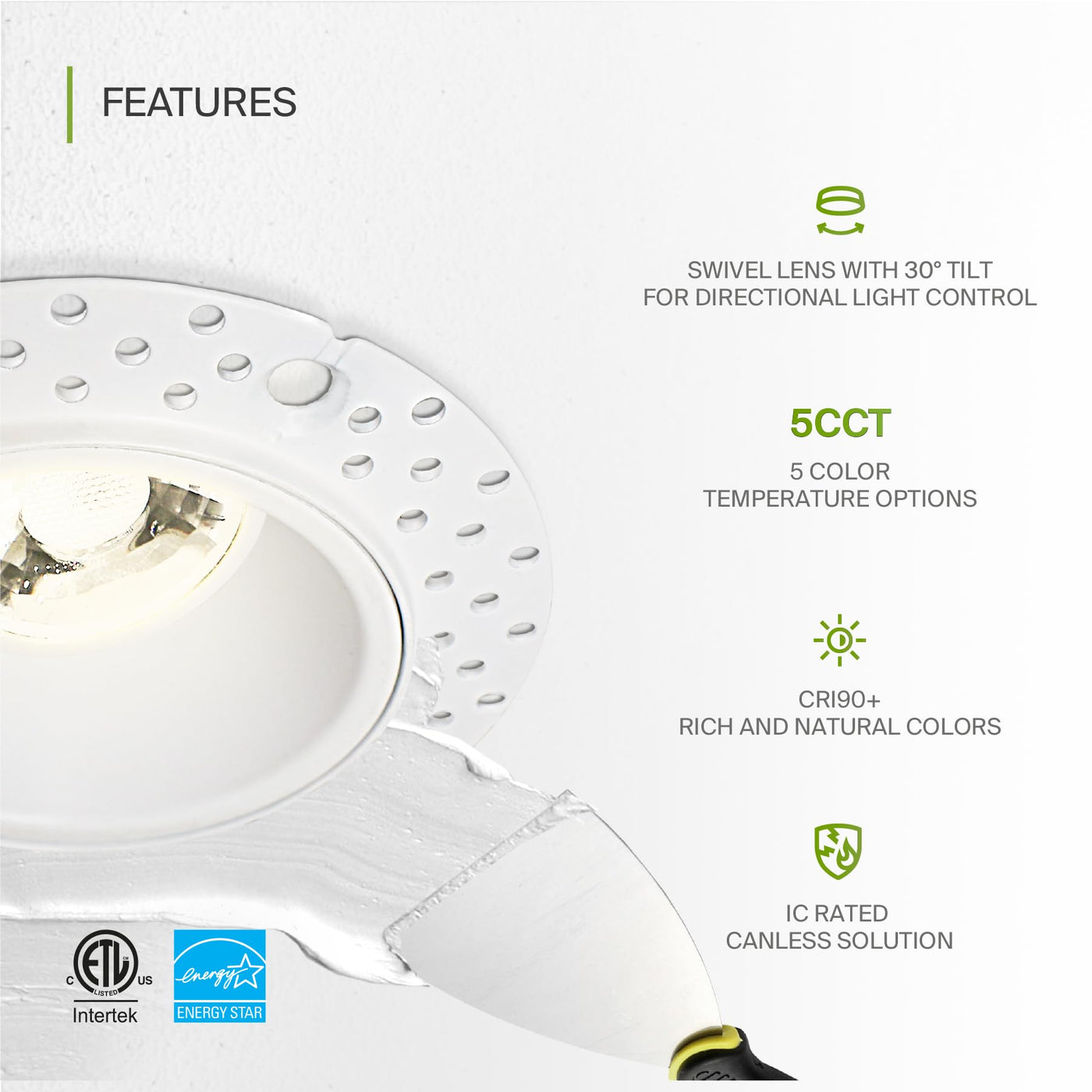- **Easy Installation**: Designed for hassle-free setup, this canless recessed lighting is IC rated, eliminating the need for additional housing. Its wet location rating makes it suitable for high-humidity areas, such as bathrooms and kitchens.