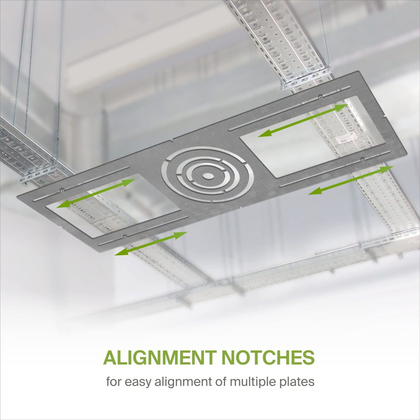 Q: What features help with the alignment of multiple plates during installation?A: The mounting plate includes alignment notches that assist in properly aligning multiple plates, ensuring a neat and organized installation for your recessed lighting.