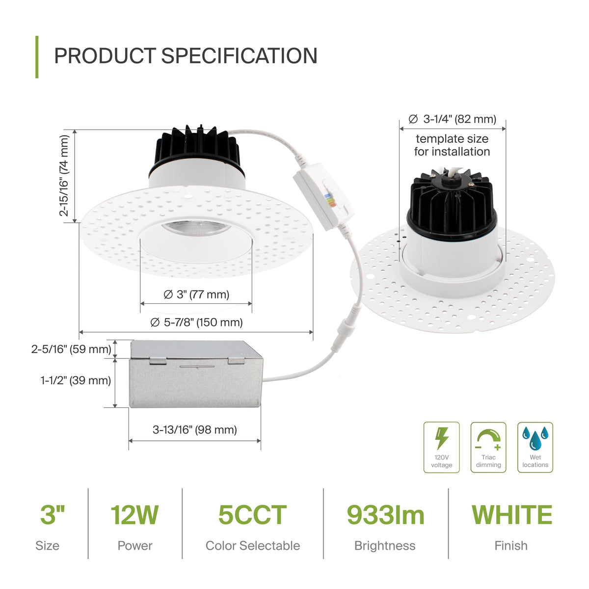 Asd 3" Trimless Led Recessed Light, 12W Dimmable, 5 Cct, Ic Rated,