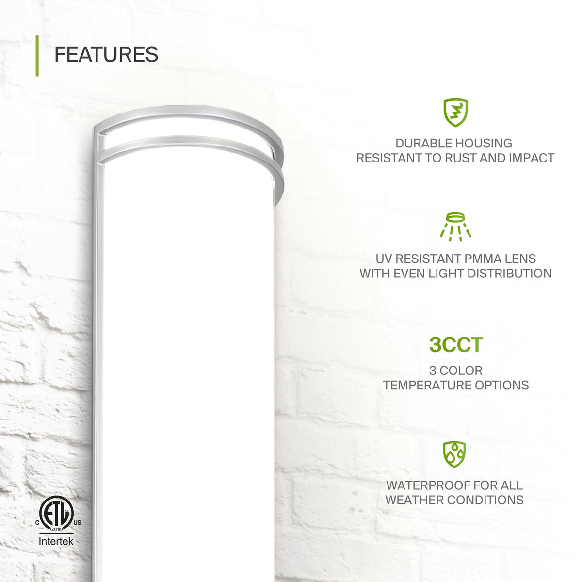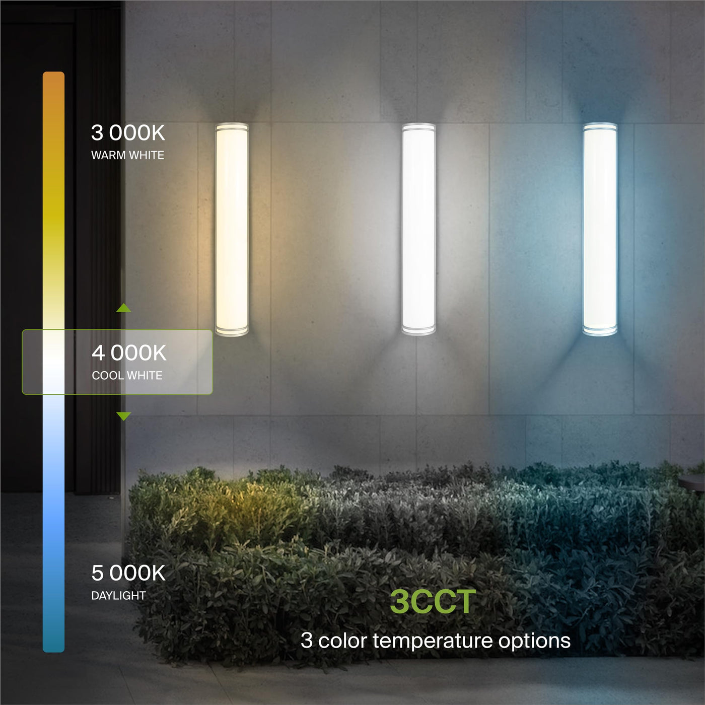 Q: What are the different color temperature options for the ASD 36 Inch LED Outdoor Wall Mount Light Fixture?A: The ASD 36 Inch LED Outdoor Wall Mount Light Fixture offers three color temperature options: 3000K Warm White, 4000K Cool White, and 5000K Daylight. You can easily switch between these options to suit your lighting needs.