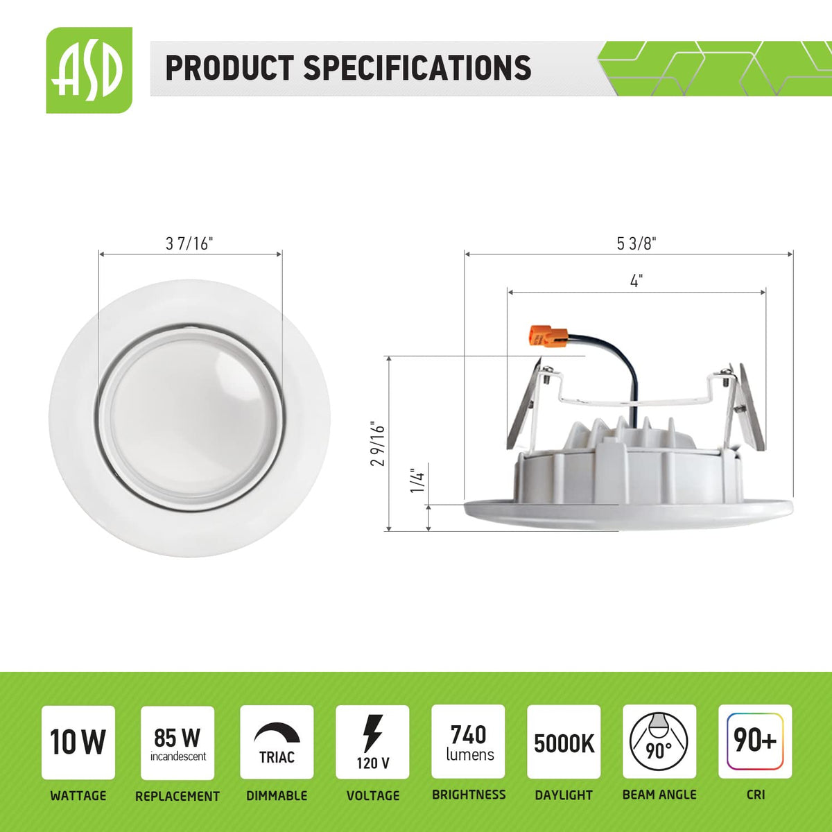 Asd 4 Inch Gimbal Retrofit Led Recessed Lights, Downlight Can 10W (85W Replacement), 740 Lm Dimmable 5000K Daylight, Cri 90, Baf