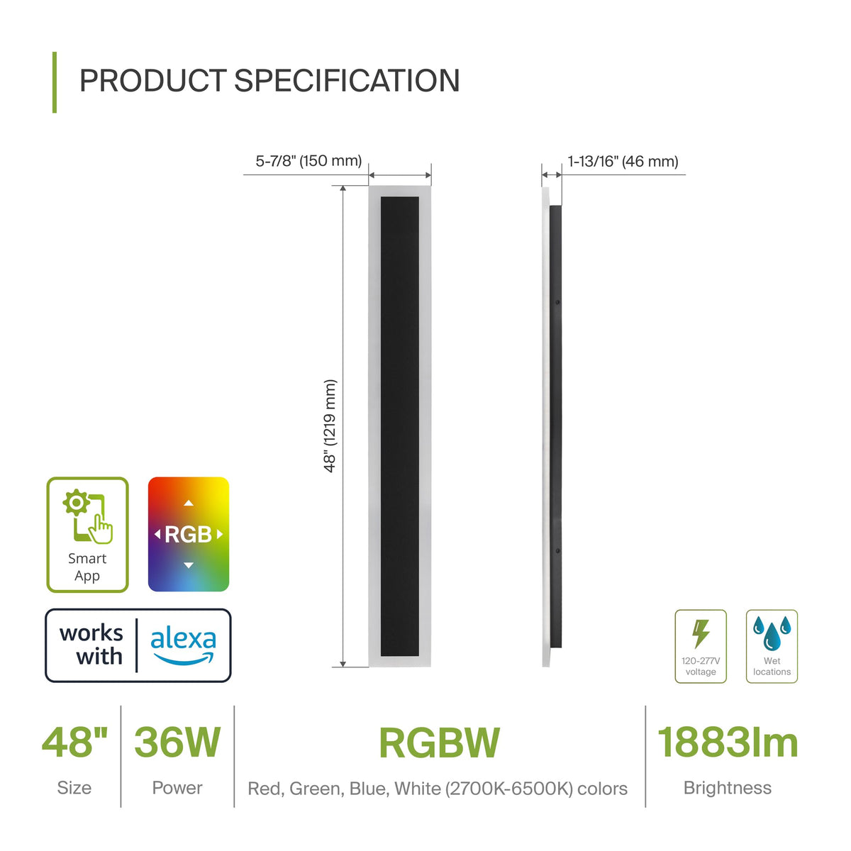 The ASD 48 Inch Smart RGBW LED Strip Light is available in a sleek black finish and is perfect for various locations including front porches, patios, entryways, and commercial spaces such as warehouses and lounges. Backed by a 5-year warranty and dedicated customer support, this product guarantees quality and durability. Transform your space with stylish, efficient lighting that meets the highest standards of safety and performance.